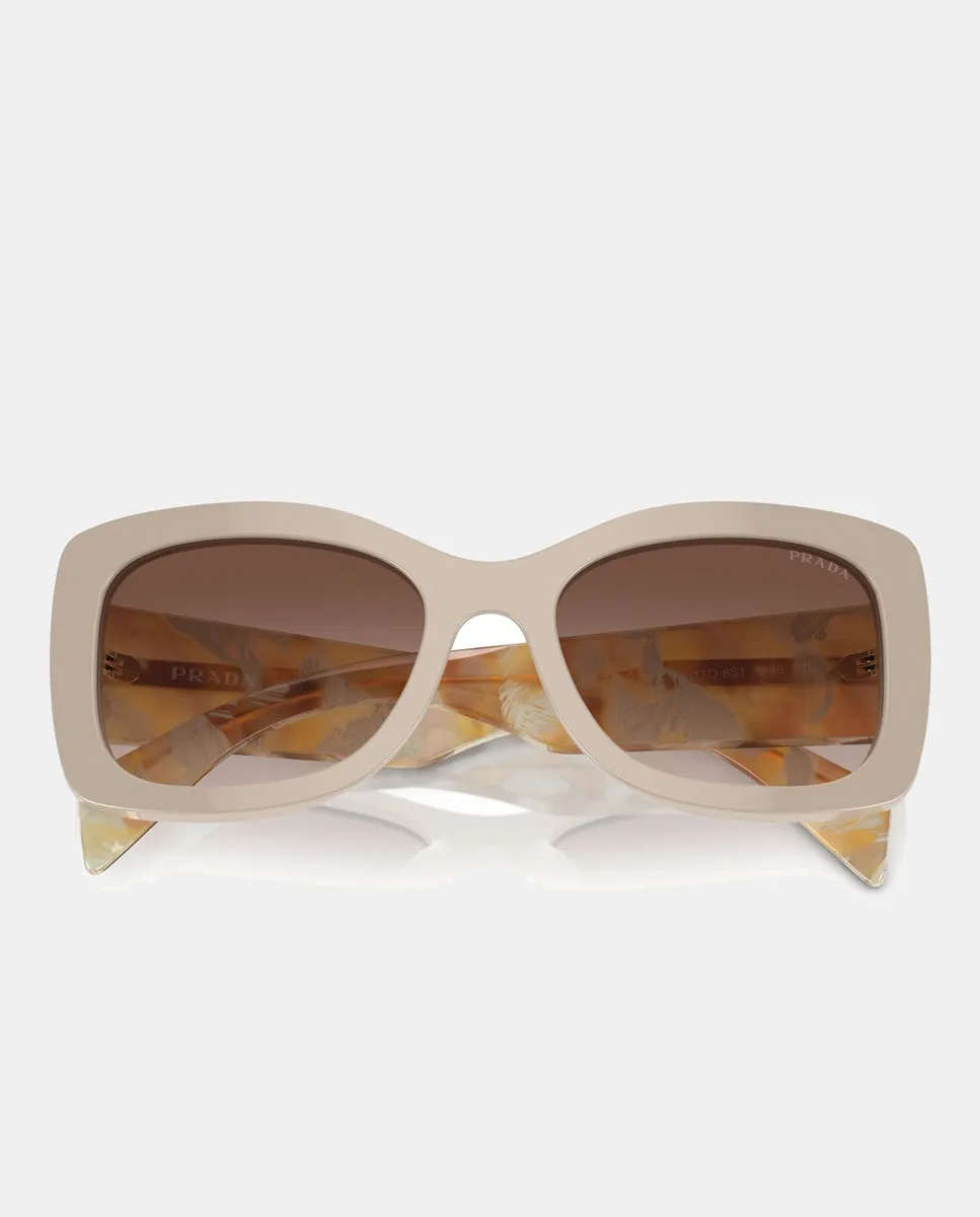 Очки модели 0PR A08S в овальной оправе из бежевого ацетата. Линзы имеют коричневый градиентный эффект.