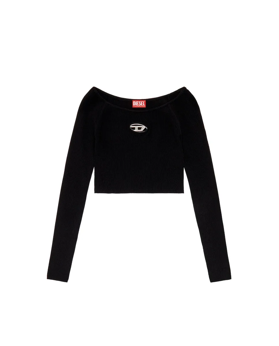 Эта женская футболка с длинным рукавом украшена овальной металлической пластиной в виде буквы D на вырезе на груди. Изготовлено из мягкого трикотажа в рубчик с добавлением вискозы из ответственно управляемых лесов, имеет вырез с открытыми плечами и облегающий крой.
