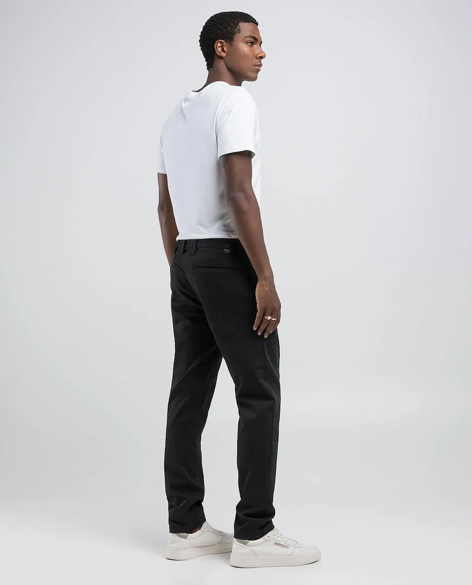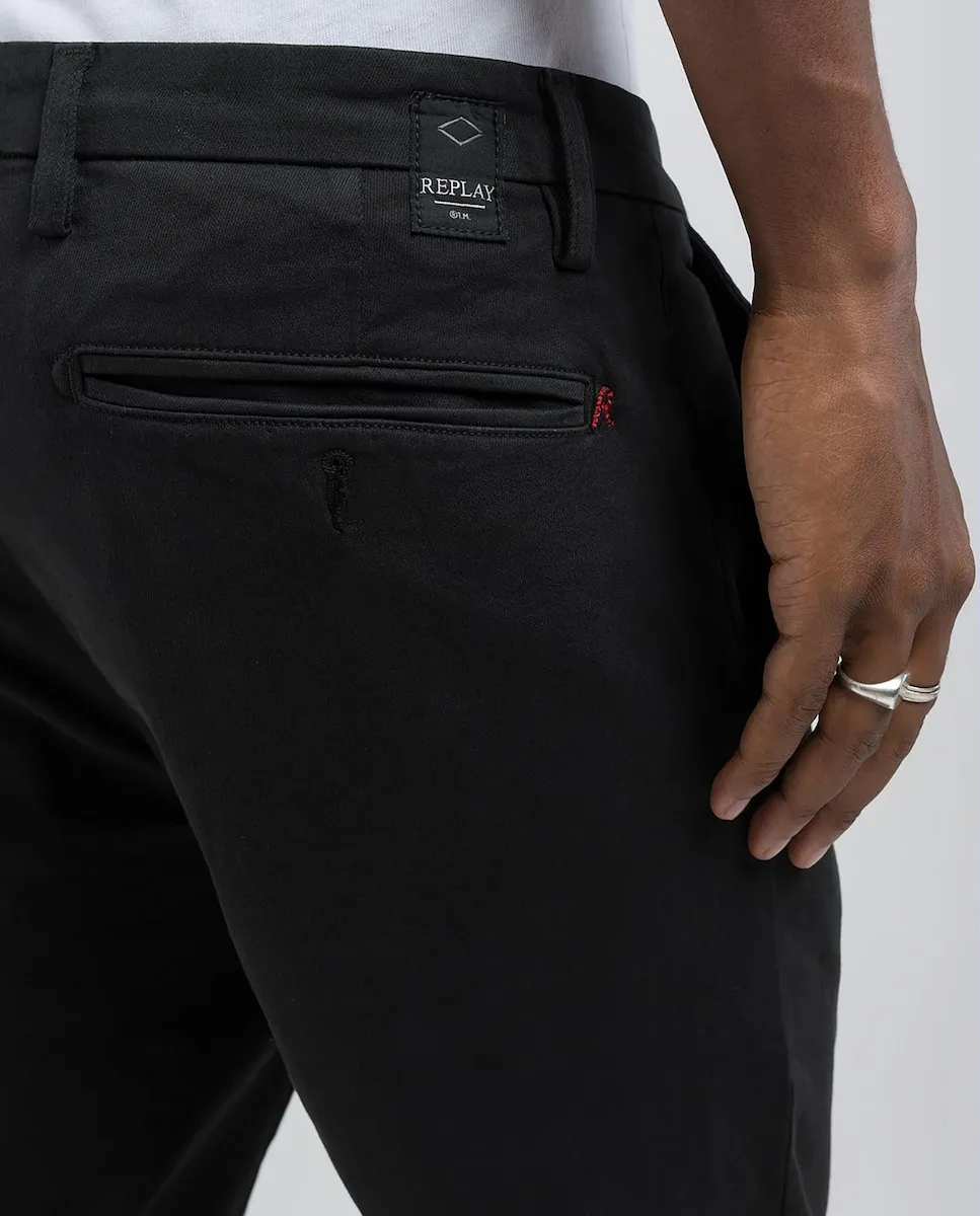 Узкие джинсы фасона чинос с обычной талией и облегающими штанинами. Модель выполнена из сверхлегкого всесезонного эластичного хлопкового денима Hyperflex плотностью 10,5 унций, окрашенного в готовом виде методом состаривания и подвергнутого обработке Stonewash. Эти мужские брюки имеют два французских кармана спереди и два прорезных кармана на пуговицах сзади, один из которых украшен культовой вышивкой R. Дизайн дополняет небольшая персонализированная вставка сзади. Застежка на пуговицы и молнию.