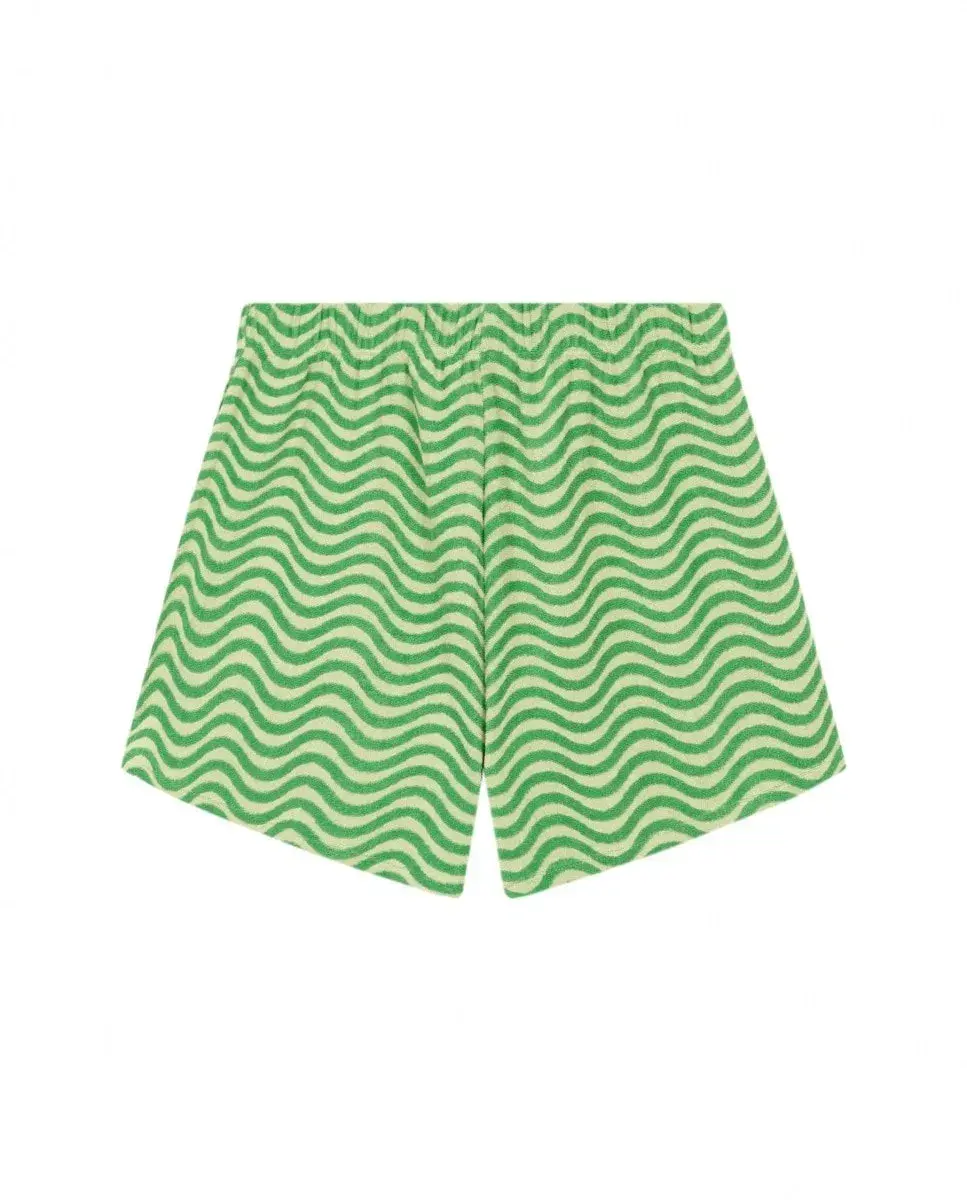 Эластичные шорты с волнами зеленого и бежевого цвета, из ткани с эффектом полотенца, специально предназначенной для плавания, с резинкой на талии для большего комфорта. Эти шорты идеально подойдут для сочетания с бикини Samba, если вы собираетесь на пляж, или с футболкой, если вы собираетесь провести день в городе. На модели размер S/M. Ее рост 1,72 см, объем груди 86 см, объем талии 66 см и объем бедер 91 см.