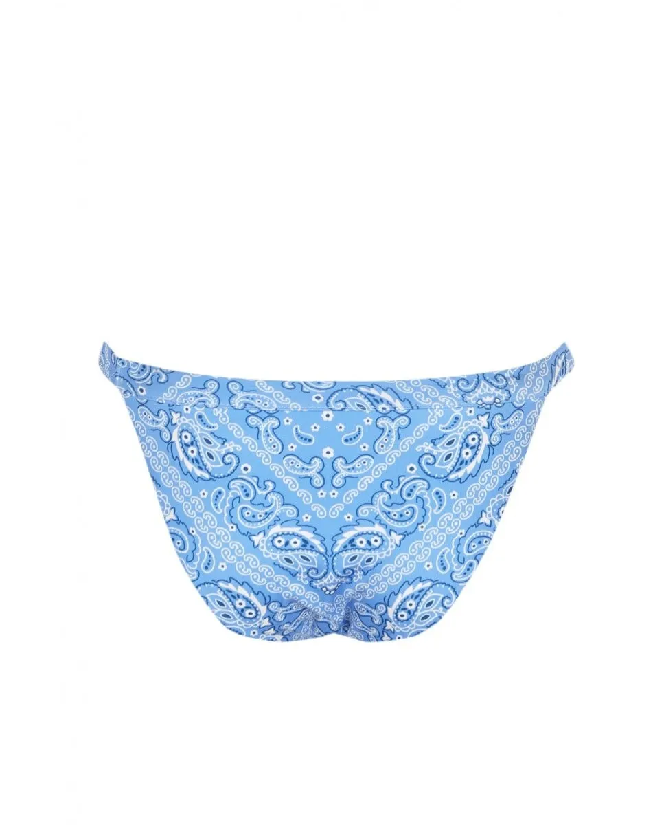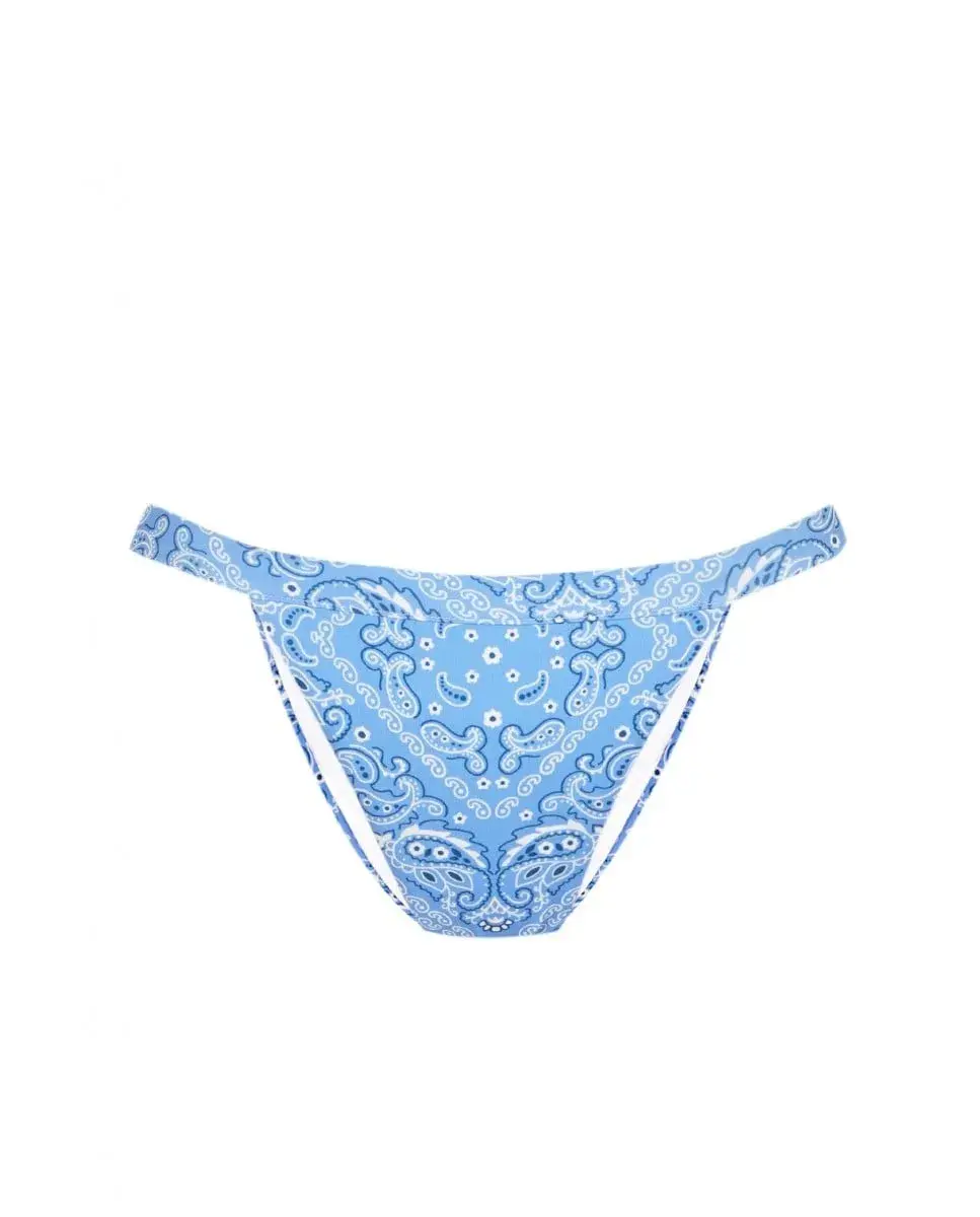 Плавки бикини с принтом бандана темно-синего цвета. Эти трусики были немного обновлены: у них более высокая посадка и более низкая спинка. Имеет резинку на талии. Спереди и сзади подкладка. На модели трусики размера S. Ее рост 1,75 см, объем груди 83 см, объем талии 65 см и объем бедер 92 см. Если ваш размер находится между двумя, мы рекомендуем выбрать больший размер.