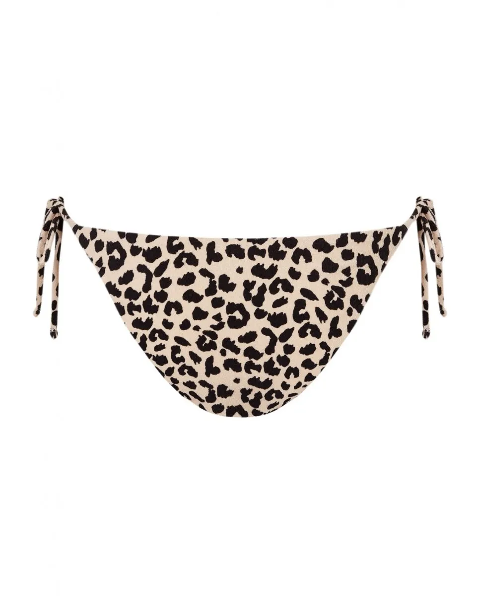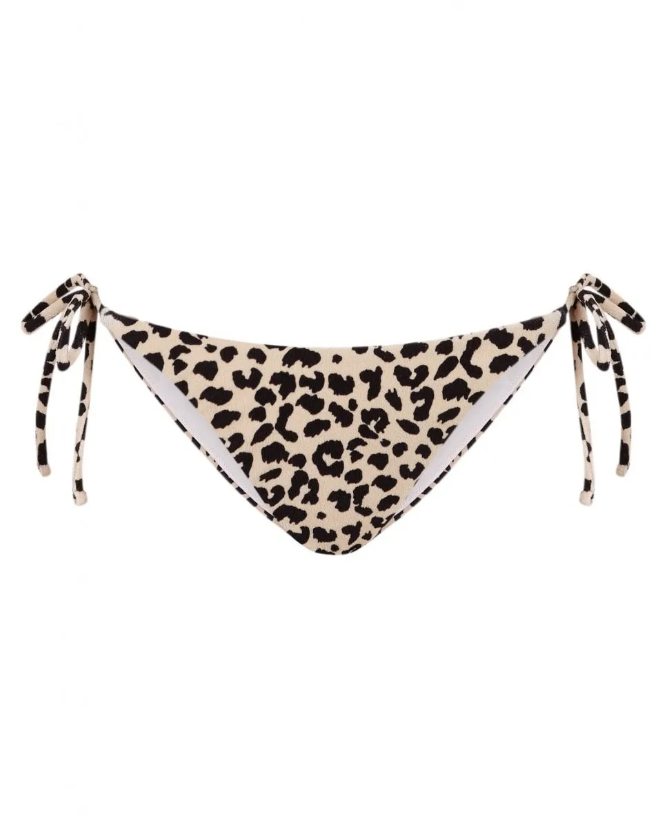 Плавки-бантики с анималистичным принтом из ткани с эффектом полотенца, специально предназначенные для плавания. Трусики в слегка бразильском стиле, полностью на подкладке, с застежкой-шнурком сбоку. На модели трусики размера S. Ее рост 1,75 см, объем талии 61 см и объем бедер 90 см.