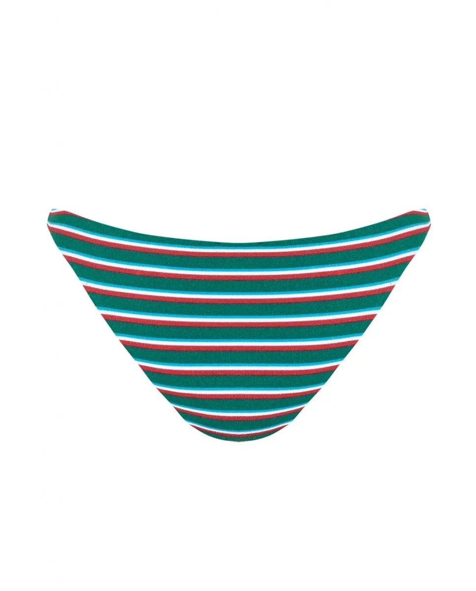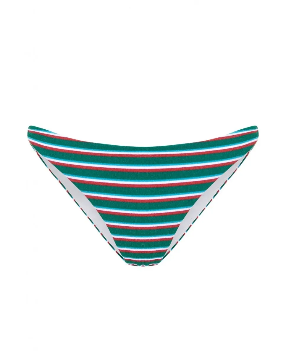 Плавки бикини с белыми и красными полосками на зеленом фоне, изготовлены из специальной ткани с эффектом полотенца для плавания. Трусики в слегка бразильском стиле, на подкладке спереди и сзади. На модели трусики размера S. Ее рост 172 см, объем талии 66 см, объем бедер 91 см.