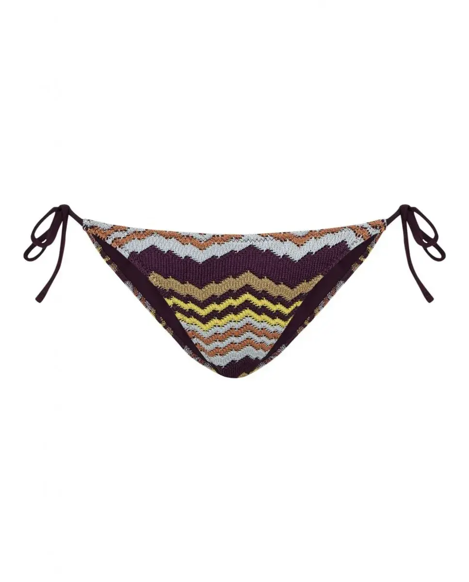 Плавки бикини связаны крючком с разноцветным геометрическим принтом. Трусики на подкладке спереди и сзади, с застежкой на бант сбоку. На модели трусики размера S. Ее рост 172 см, объем талии 66 см, объем бедер 91 см.
