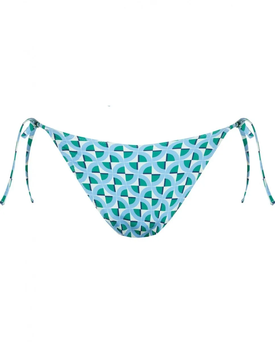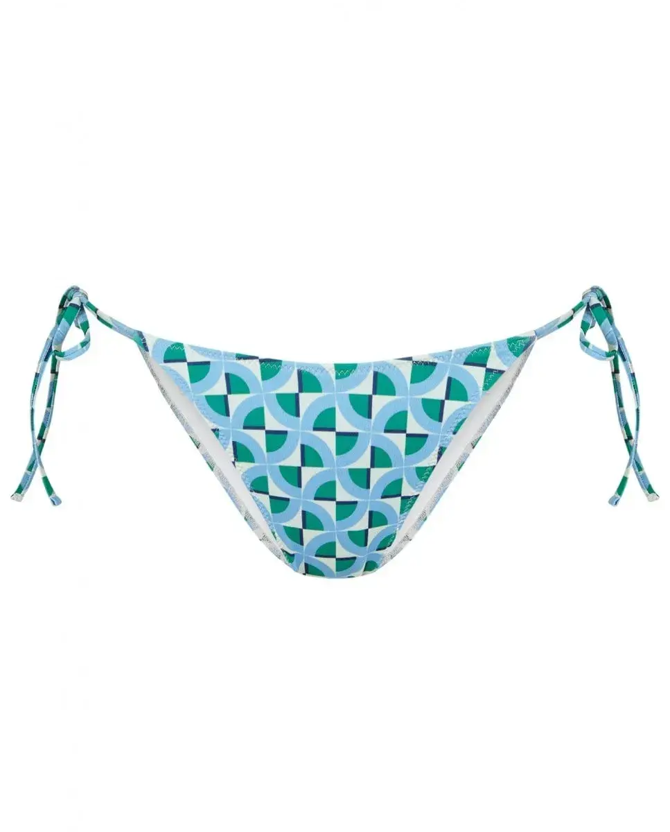 Плавки бикини с винтажным геометрическим принтом в зеленых, синих и бежевых тонах. Трусики на подкладке с застежкой-бантом сбоку. На модели трусики размера S. Ее рост 1,75 см, объем талии 61 см и объем бедер 90 см.