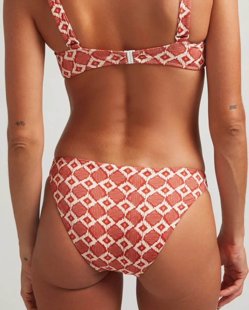 Плавки бикини с принтом «икат» в терракотовых и бежевых тонах. Спереди и сзади подкладка с легкой бразильской отделкой. На модели размер S. Ее талия составляет 61 см, а бедра — 90 см.