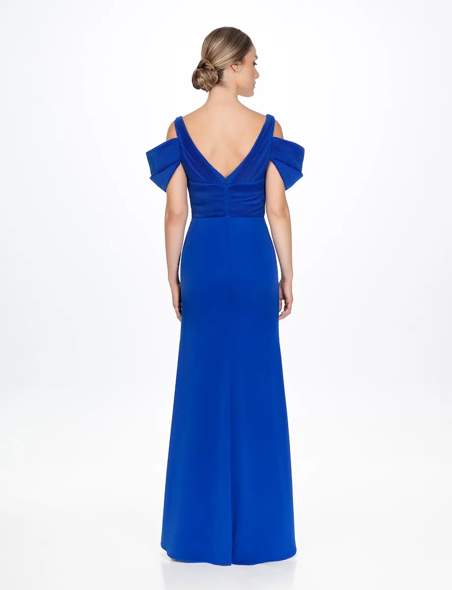 Длинное платье с асимметричной юбкой-халатом, глубоким V-образным вырезом, плиссированным лифом и рукавами-бабочками.