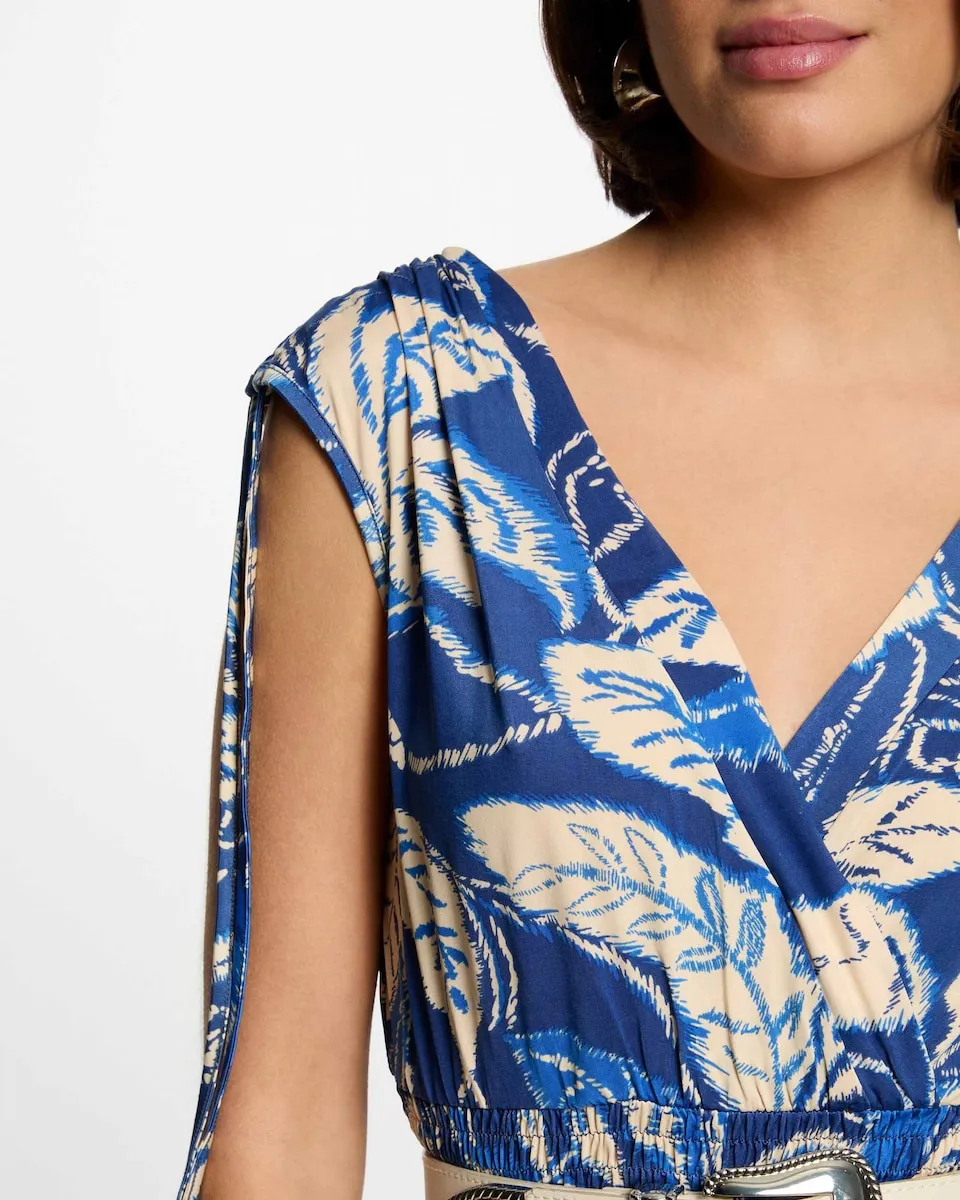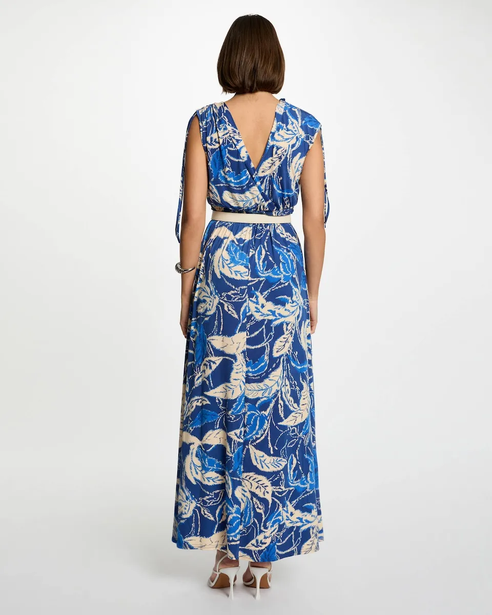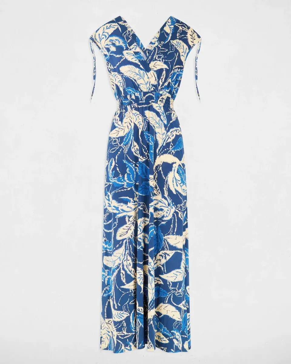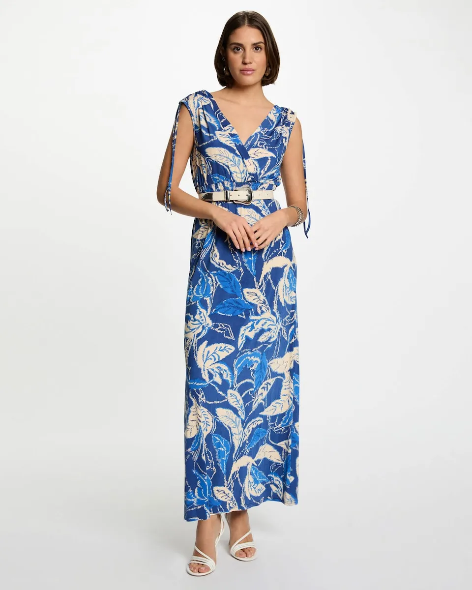 Длинное прямое платье с принтом. Прямой крой. Длинное платье. Перекрестный вырез горловины. Без рукавов. Овощной принт. Изогнутая талия. Шея в . V на спине. Детали с лентой для завязывания на плечах.