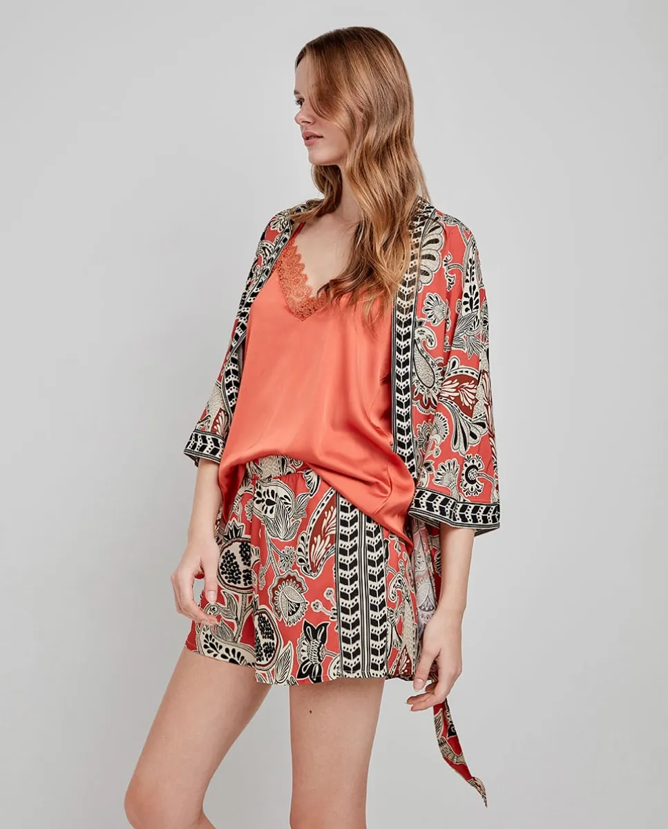 Кимоно с рукавами 3/4 из ткани с племенным принтом, завязывающееся на талии бантом. Сочетайте его с подходящими брюками и жилетом.