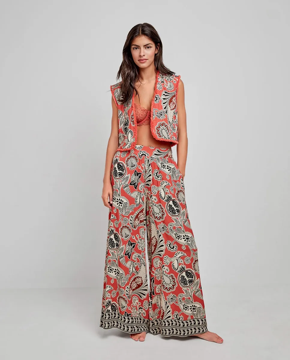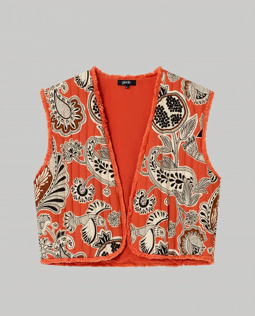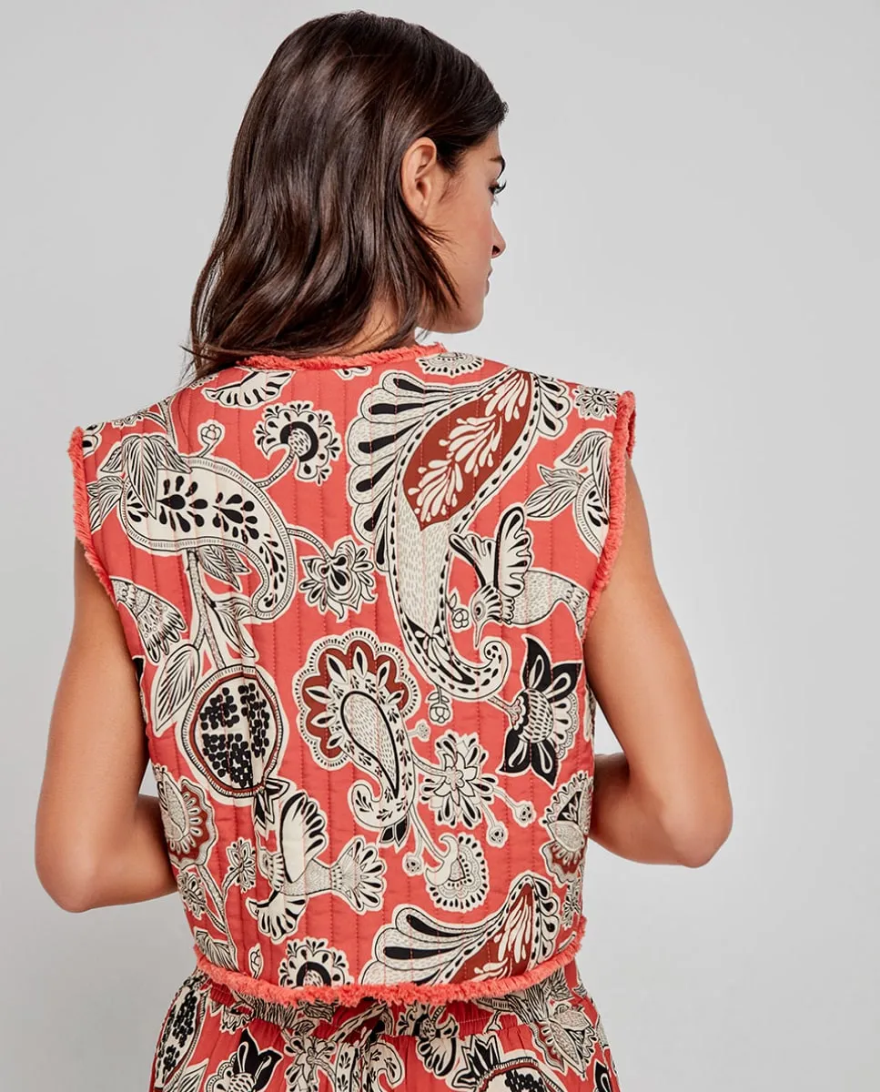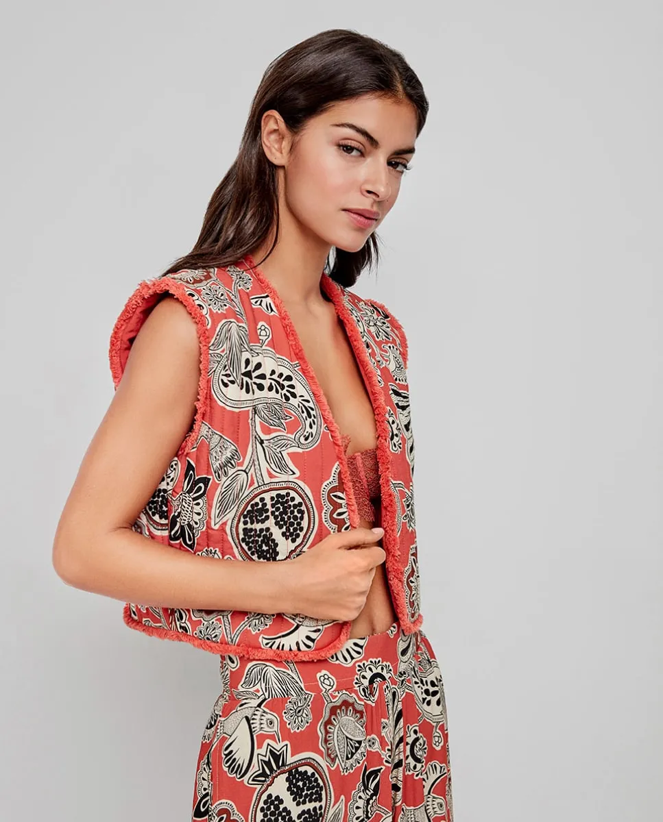 Жилет без рукавов из стеганой ткани с племенным принтом и застежкой спереди. Сочетайте его с подходящими брюками и кимоно.