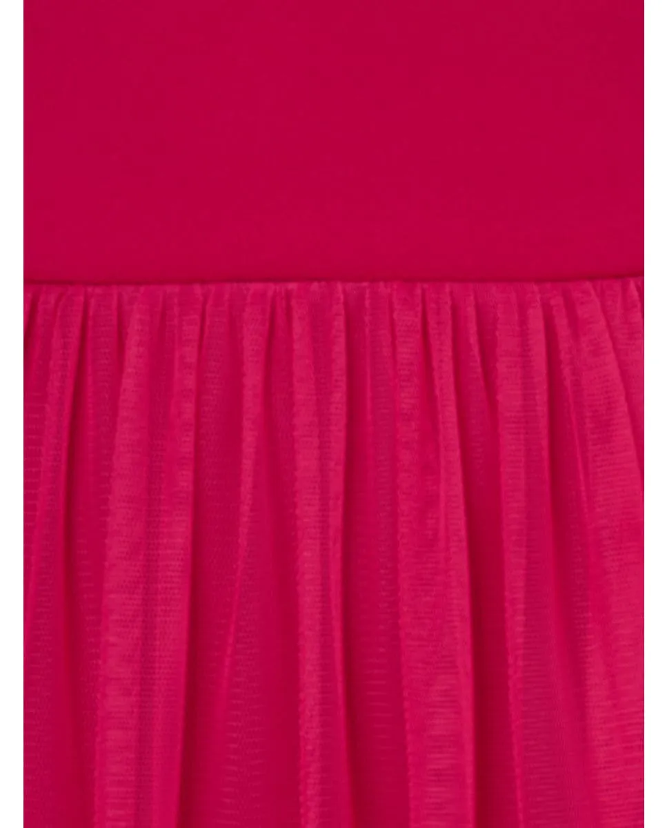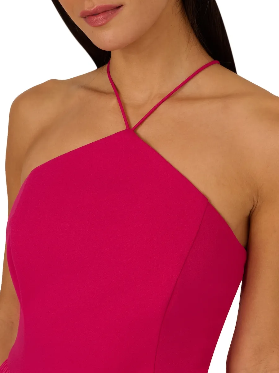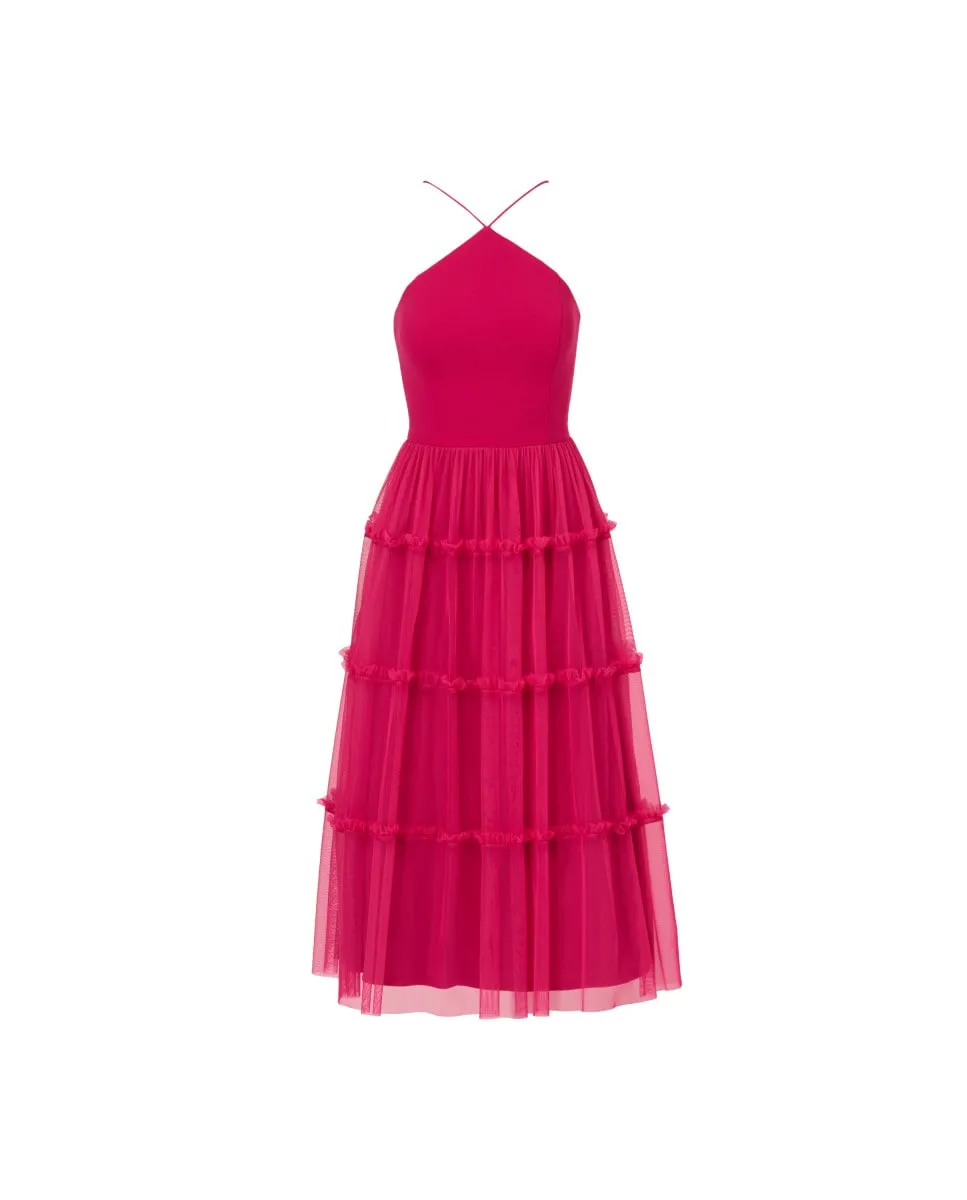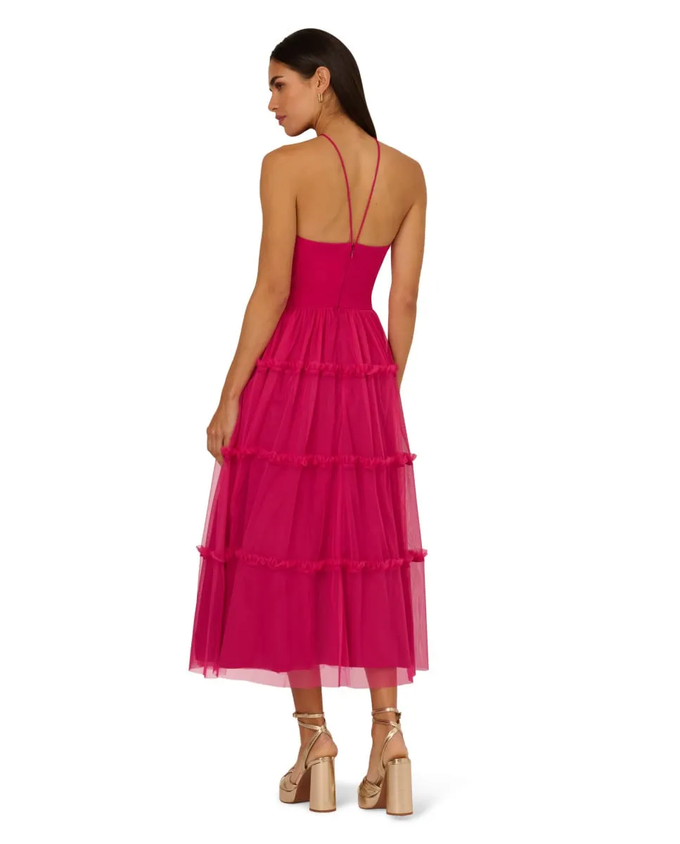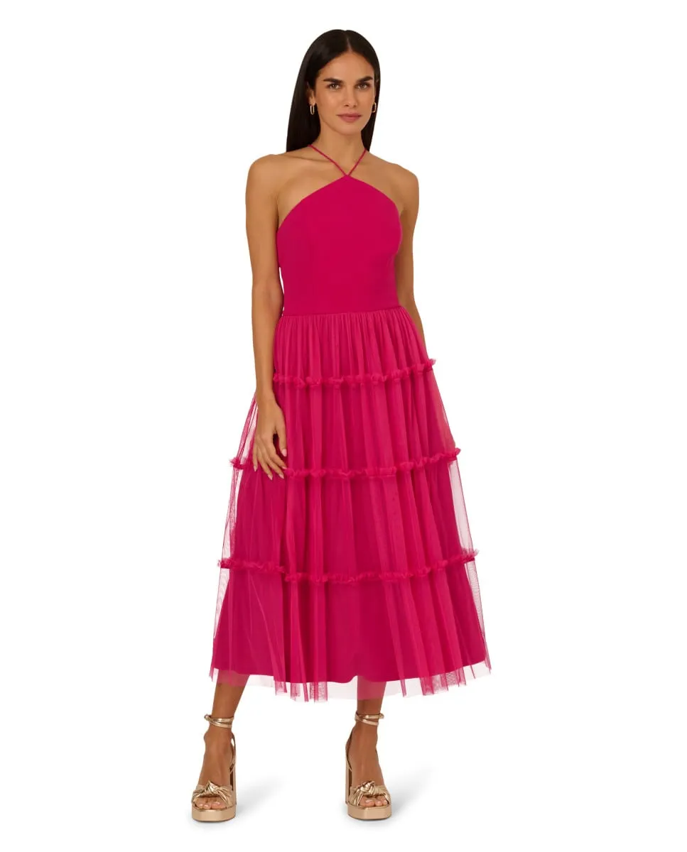 Это платье миди с вырезом-халтер на бретелях добавляет нотку гламура классическому облегающему силуэту. Трикотажный лиф обеспечивает удобную посадку, а многоярусная сетчатая юбка добавляет мягкости и романтического стиля. Это платье с застежкой-молнией сзади идеально подойдет для девичника, свидания и вечеринки.