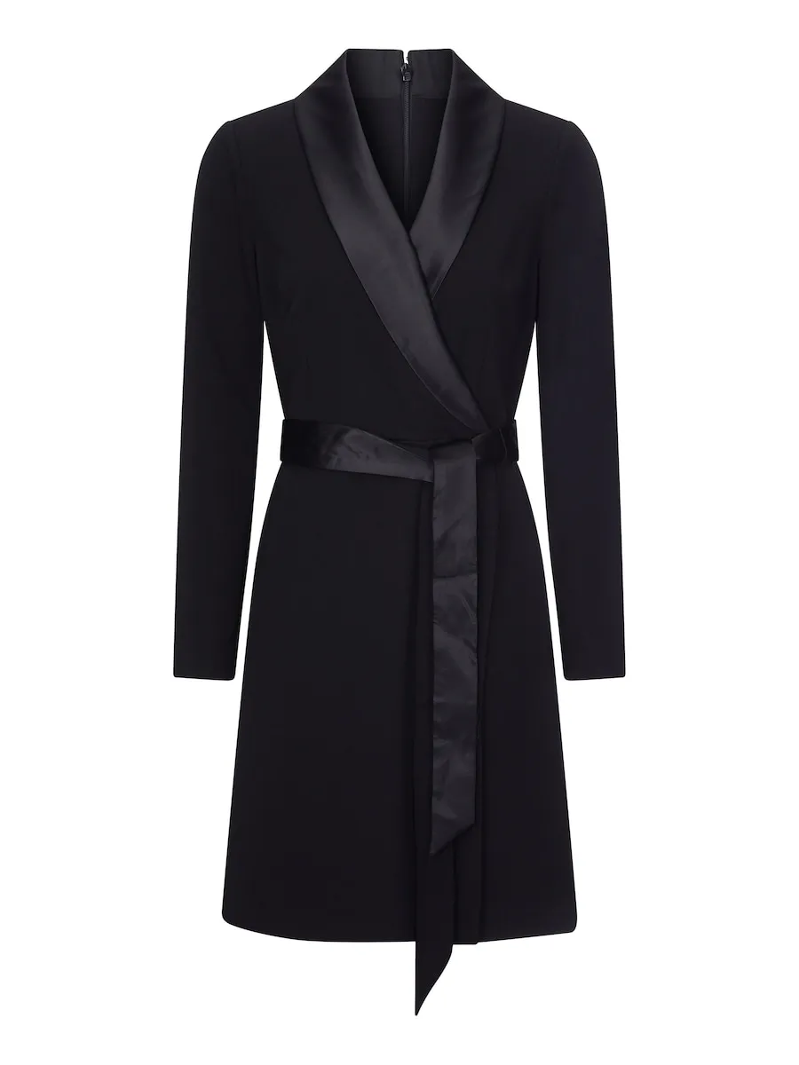 Изящная и стильная, женственная версия классического платья-смокинга выполнена из простой креповой ткани. Детали, которые нам нравятся: атласный воротник-шалька и завязанный пояс. Короткое черное платье, которое мы любим надевать на свадьбы, официальные приемы и ночные прогулки по городу.