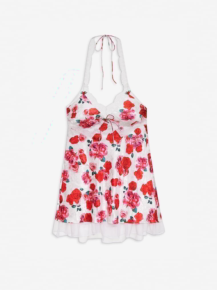 Поцелуй под омелой в этом мини-платье-комбинации — из красивого жаккарда с принтом в виде роз с контрастной кружевной отделкой под грудью и на вырезе. Оно украшено тонкими завязками и романтическими декоративными розетками.