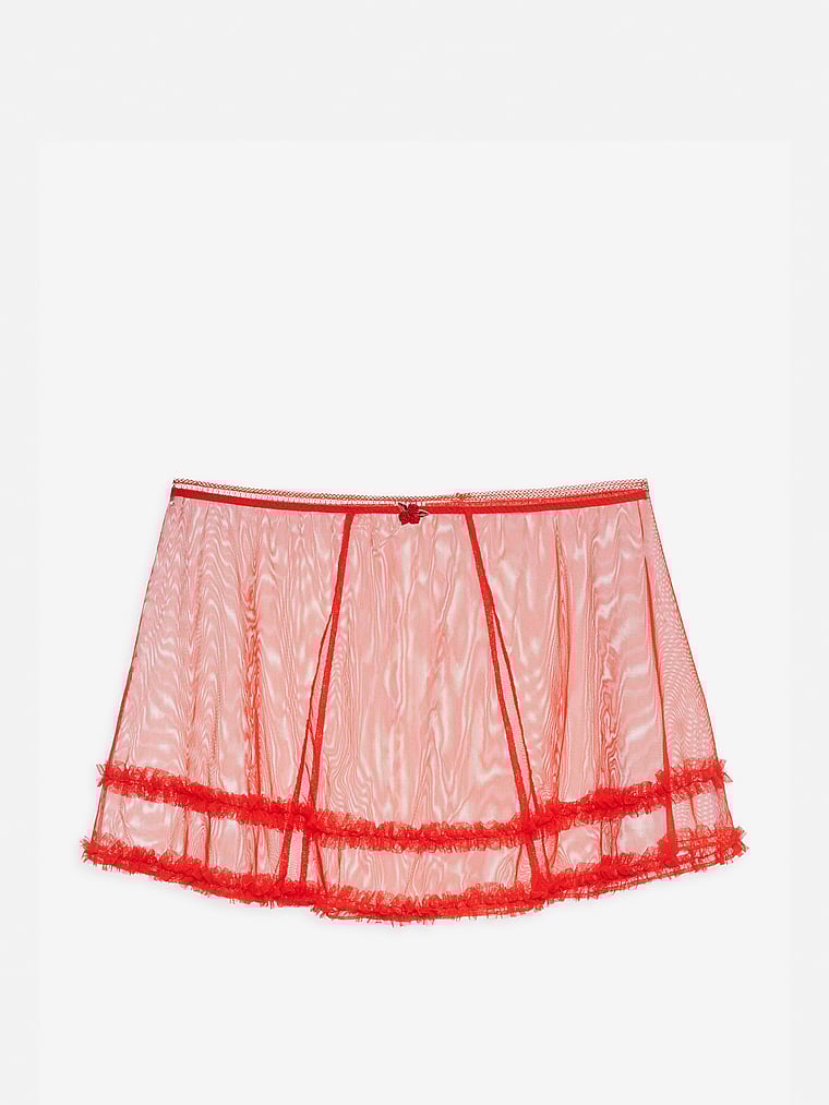 Сделайте этот отпуск незабываемым в этой красной мини-юбке и подходящем комплекте для подвязки ног. Эта юбка-комбинация из прозрачного шифона с высокой талией и легким клешем украшена оборками и нежными розетками для нотки романтики.