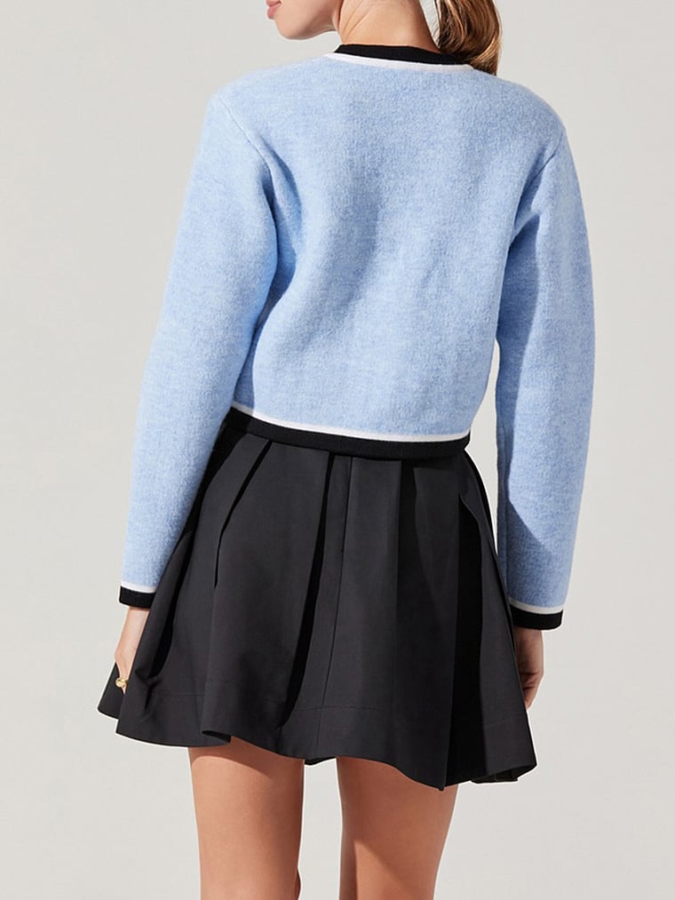 Контрастная отделка и блестящие золотые пуговицы делают этот укороченный кардиган особенной вещью, которую можно сочетать с джинсами, юбками и т. д.