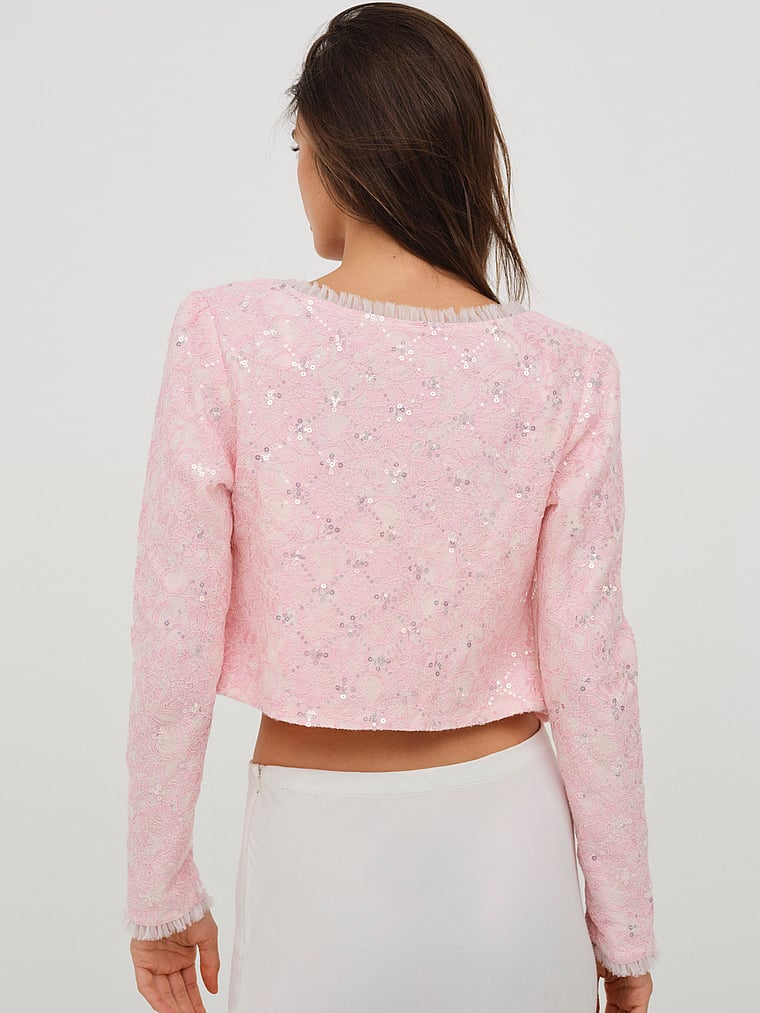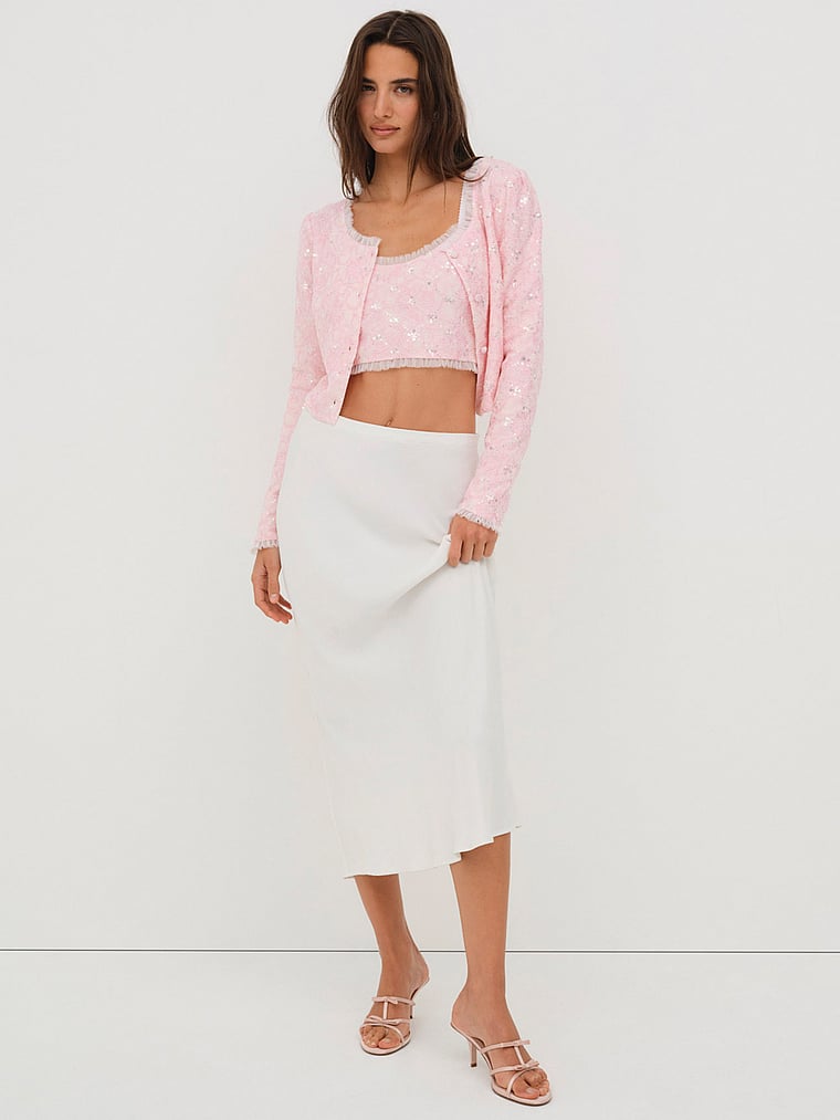 Немного блеска — это то, что нужно — этот ультрамиленький укороченный кардиган может похвастаться кружевным шифоновым оборкой с необработанными краями на шее и рукавах, а также изобилием пайеток. Сочетайте его с подходящим топом для сна, чтобы создать образ двойки. Настало время для шика.