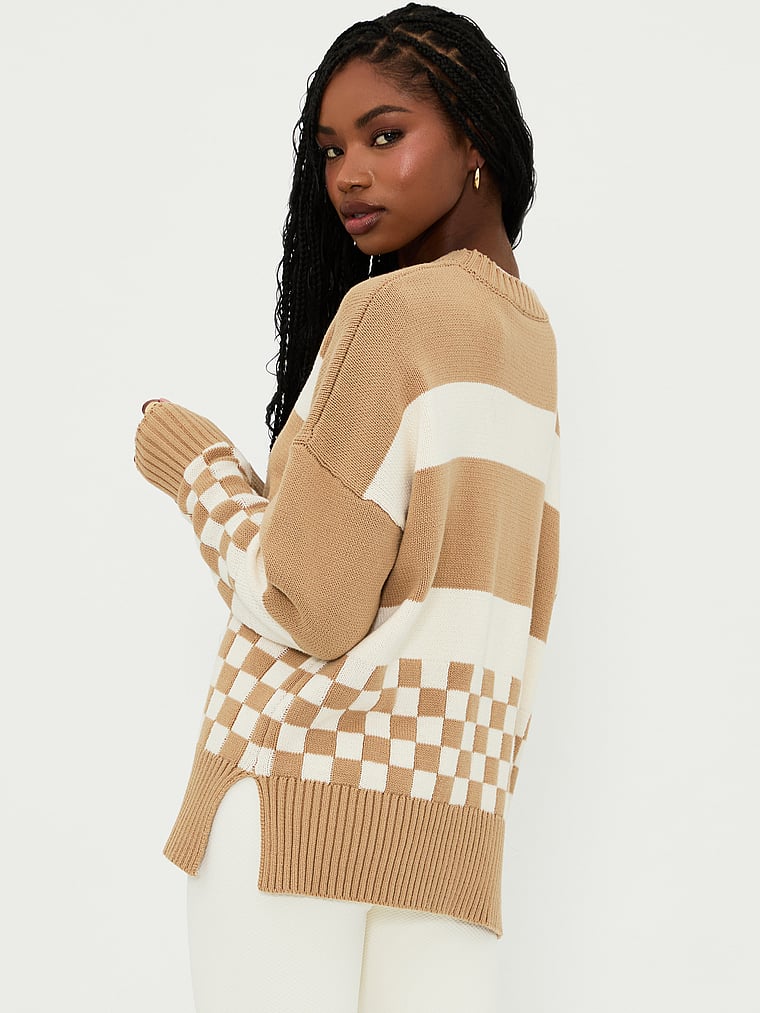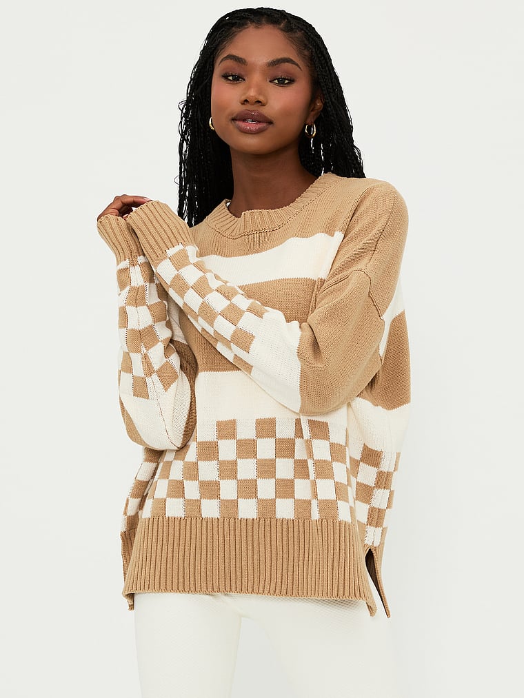 Наденьте сверху этот свободный свитер с круглым вырезом из мягкой трикотажной ткани, ребристой отделкой и забавным клетчатым принтом.
