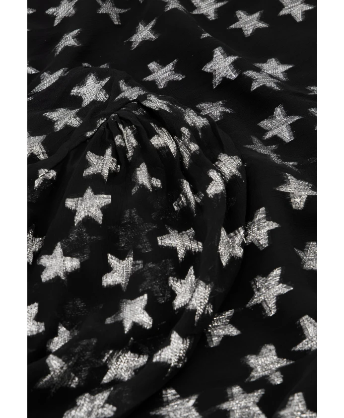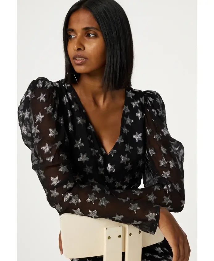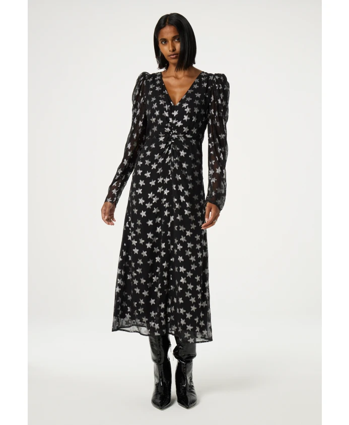 Черное женское платье миди с длинными рукавами, эластичным поясом и манжетами, а также принтом в виде серебряных звезд, который придаст вашему образу женственности.