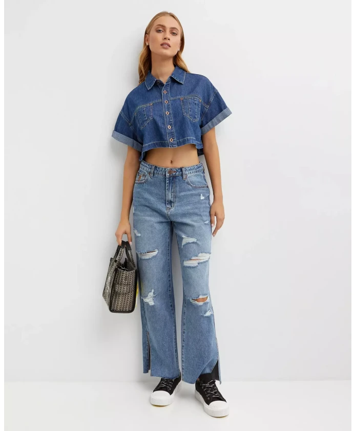 Обновите свой гардероб синей джинсовой рубашкой One Teaspoon. Укороченная рубашка с запахом, свободной посадкой, классическим воротником и короткими рукавами с манжетами — эта рубашка из 100% хлопка просто необходима современной женщине.