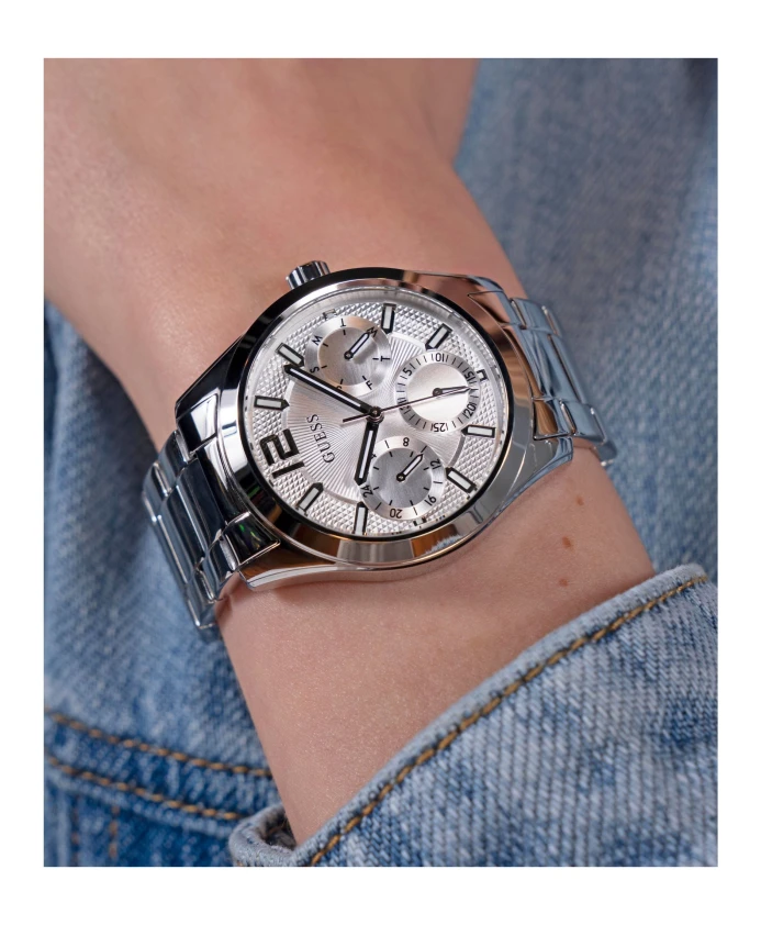 Поднимите свой стиль с кварцевыми часами Guess Zoe для женщин. Эти модные часы имеют серебряный циферблат, корпус и браслет из нержавеющей стали. Благодаря водонепроницаемости до 5 бар, функции даты и дня недели, а также 12/24-часовому дисплею эти часы одновременно стильные и функциональные. Диаметр корпуса (без заводной головки) — 38 мм.