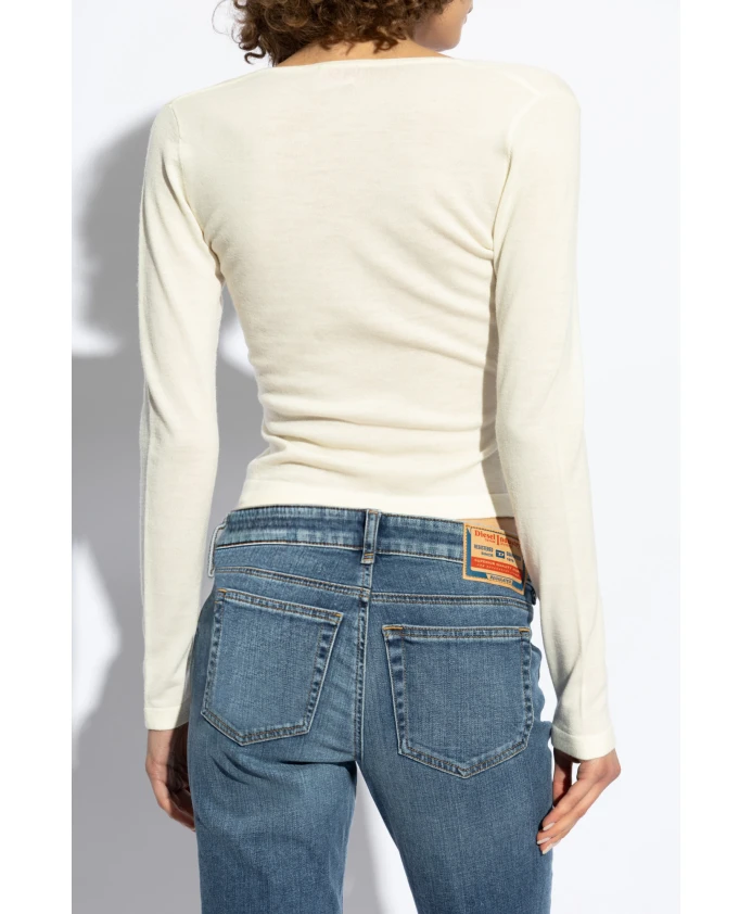 Откройте для себя изящество и элегантность с топом M-PIAFFY от DIESEL. Это изысканное изделие кремового цвета является воплощением стиля и роскоши и идеально вписывается в эксклюзивную коллекцию известного итальянского бренда. Верх полностью изготовлен из высококачественной шерсти и предлагает ЛЕГКОСТЬ И МЯГКОСТЬ, обеспечивая высочайший уровень комфорта. Облегающий силуэт с длинными рукавами и V-образным вырезом тонко подчеркивает женственную фигуру, а оборки на груди придают исключительный шарм. Уникальный металлический логотип посередине груди придает топу шика и уникальности, делает его особенным. В интерьере хорошо виден логотип бренда, свидетельствующий о его престиже. ПОЧЕМУ СТОИТ КУПИТЬ ЭТОТ ТОВАР? * Исключительный дизайн и облегающий крой, подчеркивающий силуэт. * Изготовлен из роскошной шерсти, обеспечивающей комфорт и элегантность. * Уникальные детали, выделяющиеся среди других дизайнов. Размеры модели: Рост: 177 см. Грудь: 83 см. Талия: 61 см. Бедра: 89 см. На модели размер одежды: S.