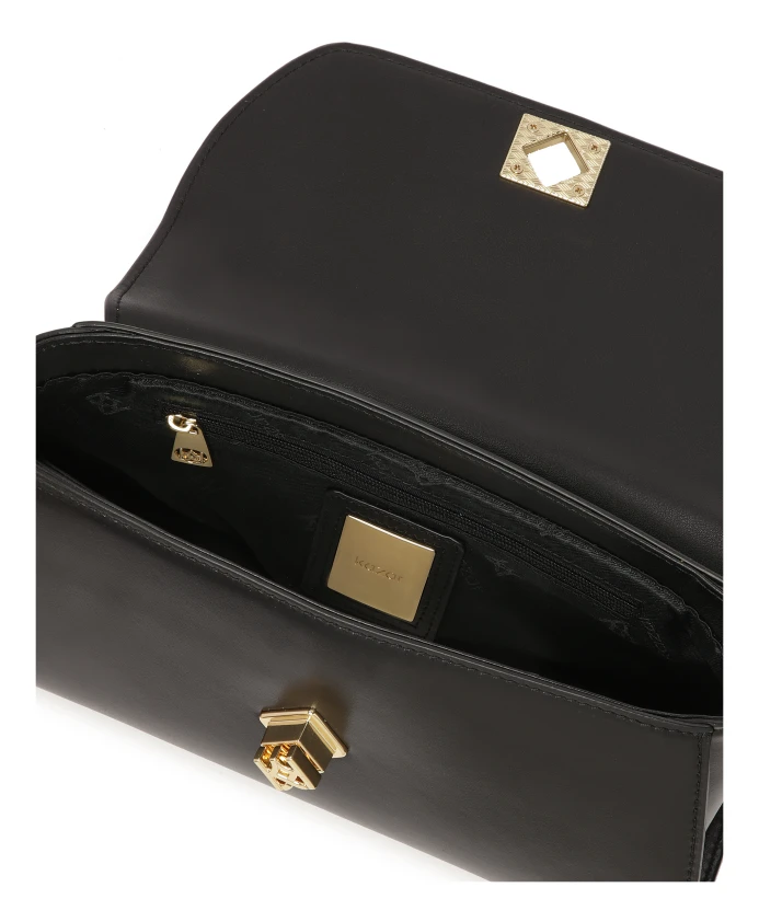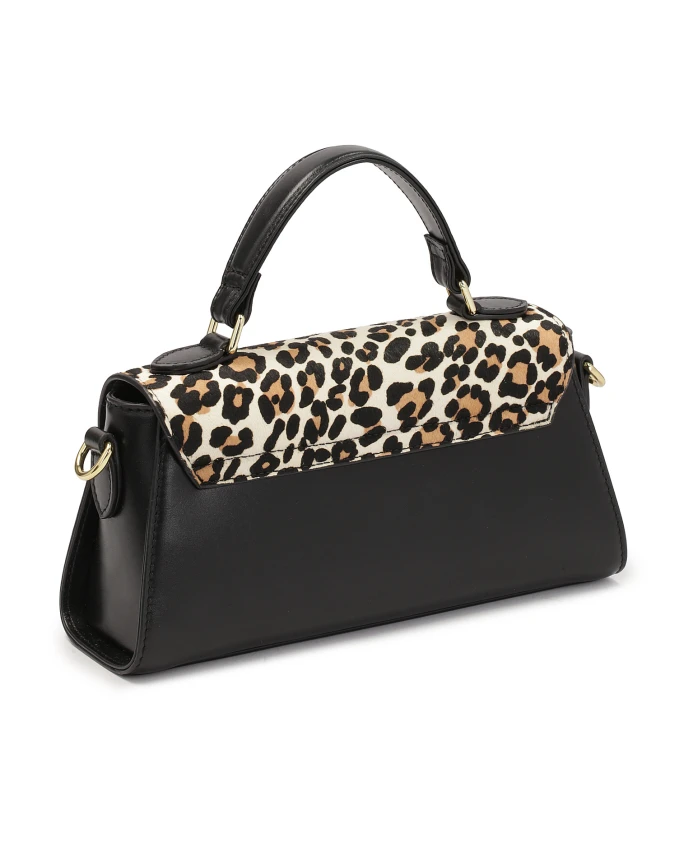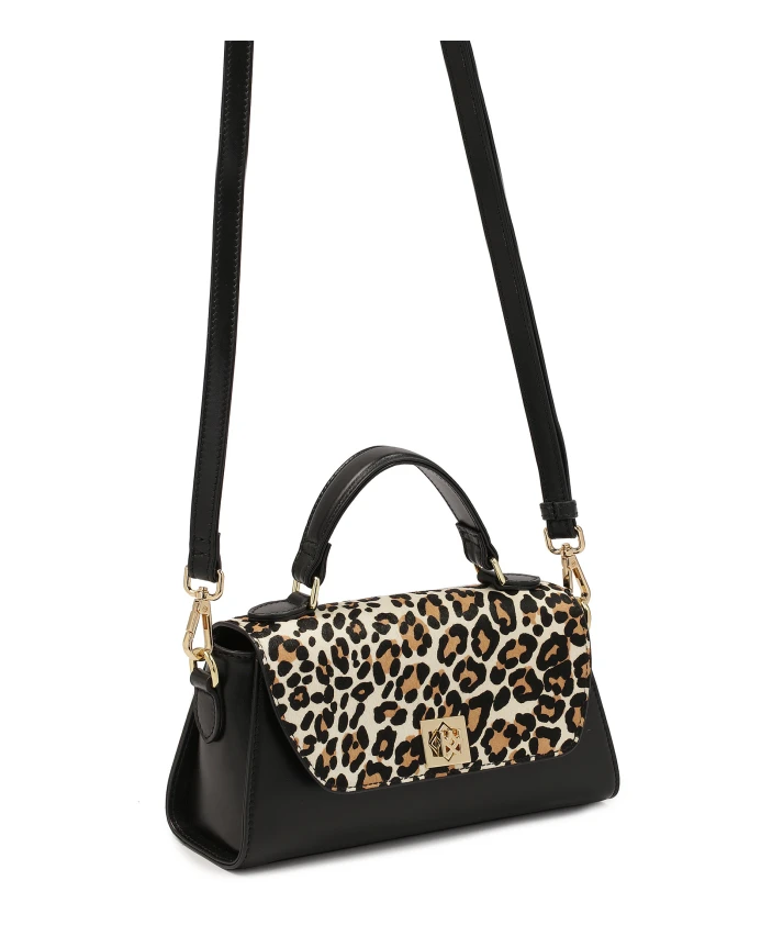 Очаровательная небольшая сумочка жесткой конструкции из натуральной черной кожи – уникальный аксессуар с утонченным характером. Компактный, элегантный крой с клапаном, закрывающимся на стильный поворотный замок, сочетает в себе классику и современность. Клапан украшен модным леопардовым принтом и натуральной кожей, которая привлекает внимание и придает уникальный вид. Сумка оснащена ручкой, позволяющей элегантно носить ее, и съемным длинным ремнем, позволяющим носить ее через плечо или по диагонали для большей универсальности. Эта модель представляет собой идеальное сочетание элегантности и модного выражения, идеально подходящее для особых случаев. Подробности о товаре: Сумка имеет 1 отделение, закрывающееся клапаном с поворотным замком. Имеет 1 открытый карман и 1 карман на молнии. Сумочка оснащена съемным регулируемым ремнем и короткой ручкой.
