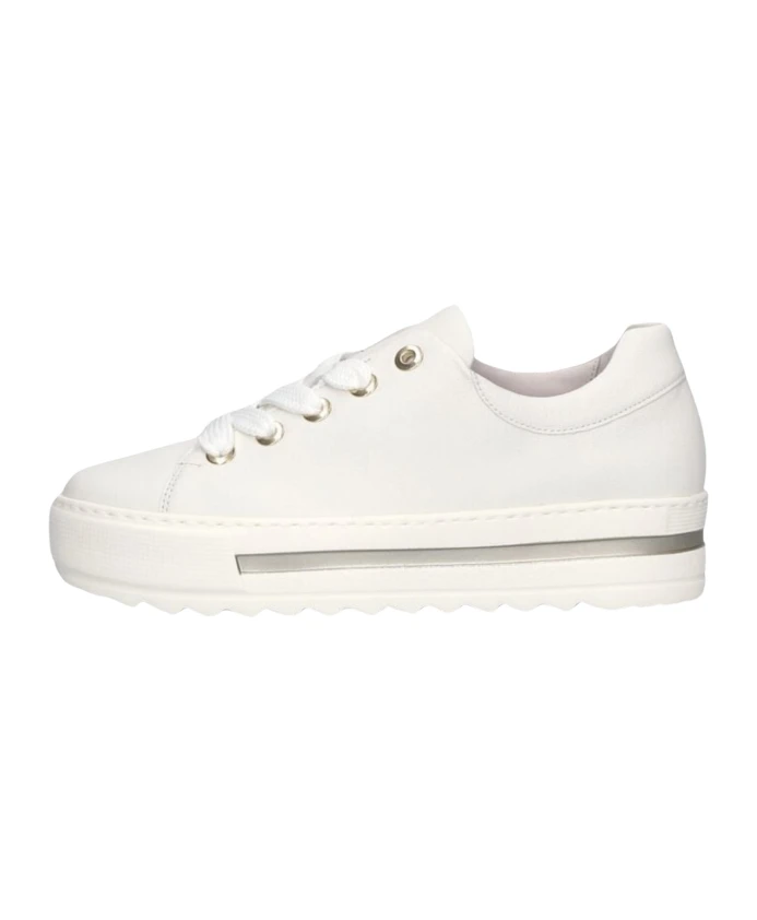 Подчеркните свой стиль с помощью этих элегантных и удобных женских кроссовок Gabor. Ярко-белые легкие кроссовки 496 с подошвой на платформе входят в коллекцию Gabor Comfort. Модель изготовлена из слегка блестящей телячьей кожи и имеет застежку на шнуровке с большими золотистыми люверсами и модными пушистыми шнурками. Золотая акцентная полоса по краю подошвы дополняет люверсы и белую кожу и придает вашему образу элегантность. Внутренняя часть сочетает в себе кожу и текстиль с эффектом замши, а съемная кожаная стелька Optifit обеспечивает амортизацию и поддержку суставов. Модная подошва на платформе толщиной 4 см с защитным носком и прочной рифленой подошвой обеспечивает гибкость и превосходное сцепление. Где вы будете носить эти универсальные кроссовки?
