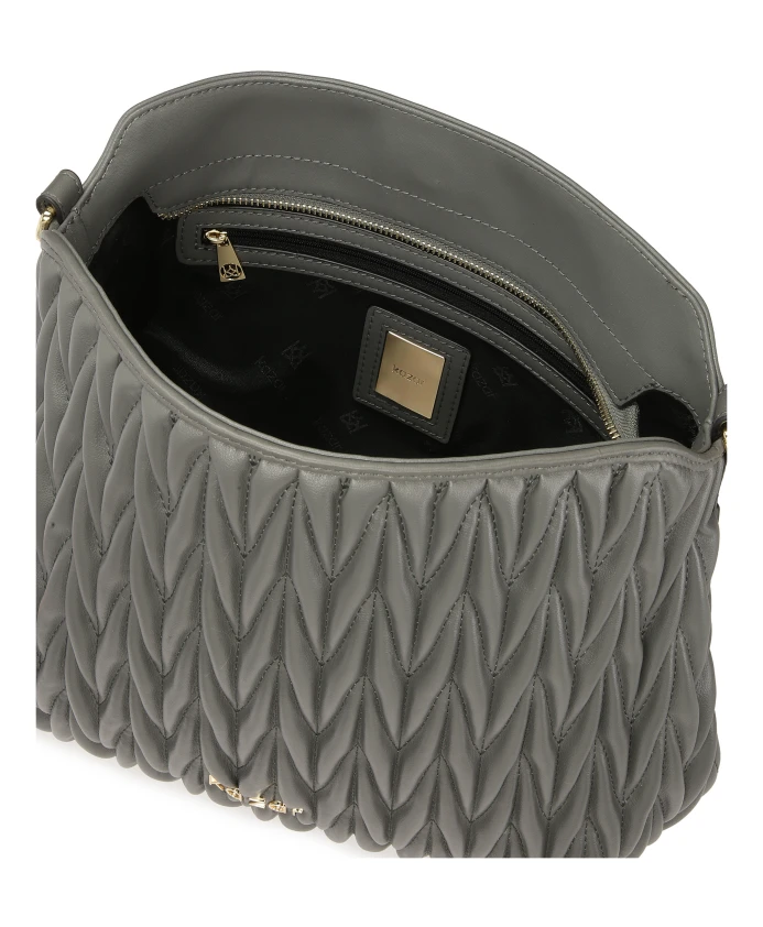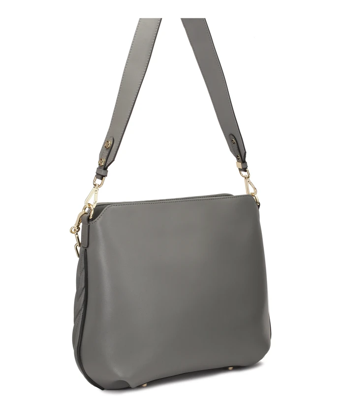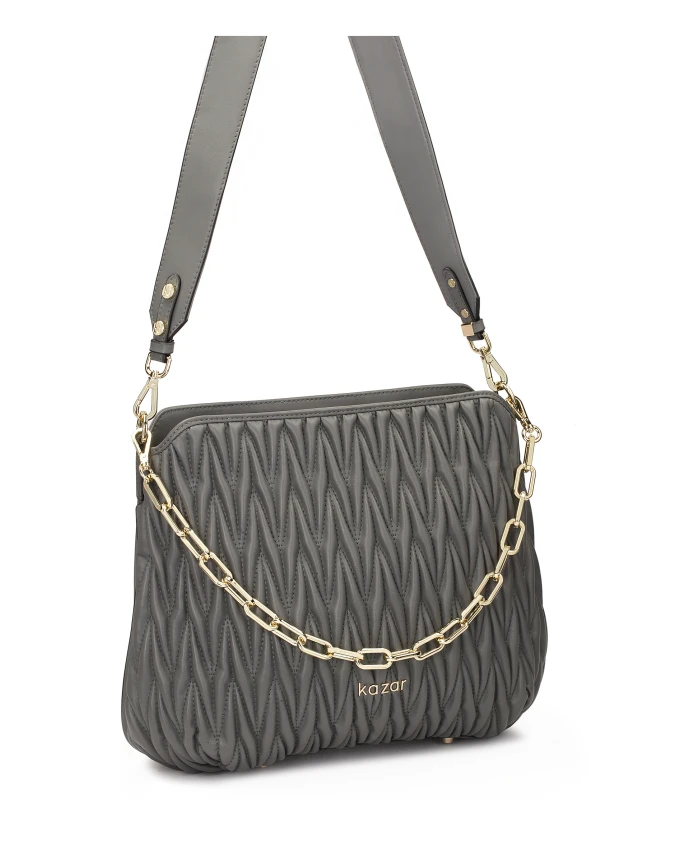 Элегантная сумочка из качественной натуральной кожи серого тона, прекрасно сочетающая в себе функциональность и современный дизайн. Их лицевая часть украшена эффектным стеганым узором, который не только обогащает эстетику изделия, но и увеличивает его долговечность. Фирменным элементом является тонкая металлическая цепочка, которая добавляет классности и позволяет носить сумку по-разному. Кроме того, в комплект поставки входит кожаный плечевой ремень для удобного ношения и регулировки. Подробности о товаре: Сумочка имеет 1 основное отделение на магните и молнии. Имеет 1 открытый карман и 1 карман на молнии. Кожаный ремешок съемный, но не регулируемый. Цепочка съемная. Дно сумки имеет металлические ножки.