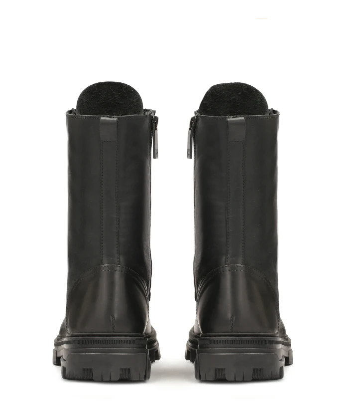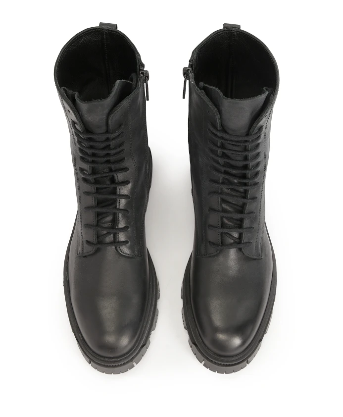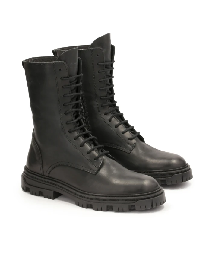 Черные ботинки из натуральной кожи с очень высоким голенищем – это элегантная и функциональная обувь, сочетающая современный стиль с классическим минимализмом. Простой дизайн делает их универсальными и подходящими для самых разных стилей. Голенище длиной до икры обеспечивает дополнительную поддержку и защиту стопы и лодыжки. Обувь оснащена шнурками спереди для точной посадки и боковой молнией для быстрого надевания и снятия. Гладкая кожаная поверхность и тонкий крой придают обуви современный и изысканный вид. Подошва изготовлена из прочного материала, обеспечивающего хорошее сцепление и комфорт. Подкладка из натуральной кожи внутри обуви гарантирует высокий комфорт даже в холодные дни сезона.