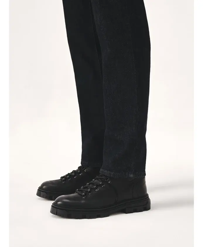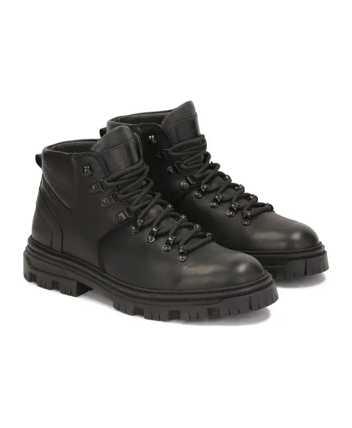 Классические черные мужские ботинки из натуральной кожи с матовым покрытием – незаменимая модель обуви в осенне-зимнем сезоне. Эта обувь имеет прочную конструкцию, обеспечивающую долговечность и комфорт. Металлические петли придают изделию изысканный, но современный вид и гарантируют надежное и стабильное закрытие. Подошва в виде клеверного листа обеспечивает превосходное сцепление и долговечность и отлично работает в различных погодных условиях. Представленные ботинки – отличный выбор для мужчин, которые ценят классический стиль, комфорт и высокое качество исполнения. Подкладка из натуральной кожи адаптируется к форме стопы, обеспечивая комфорт и удобство.