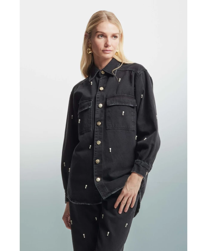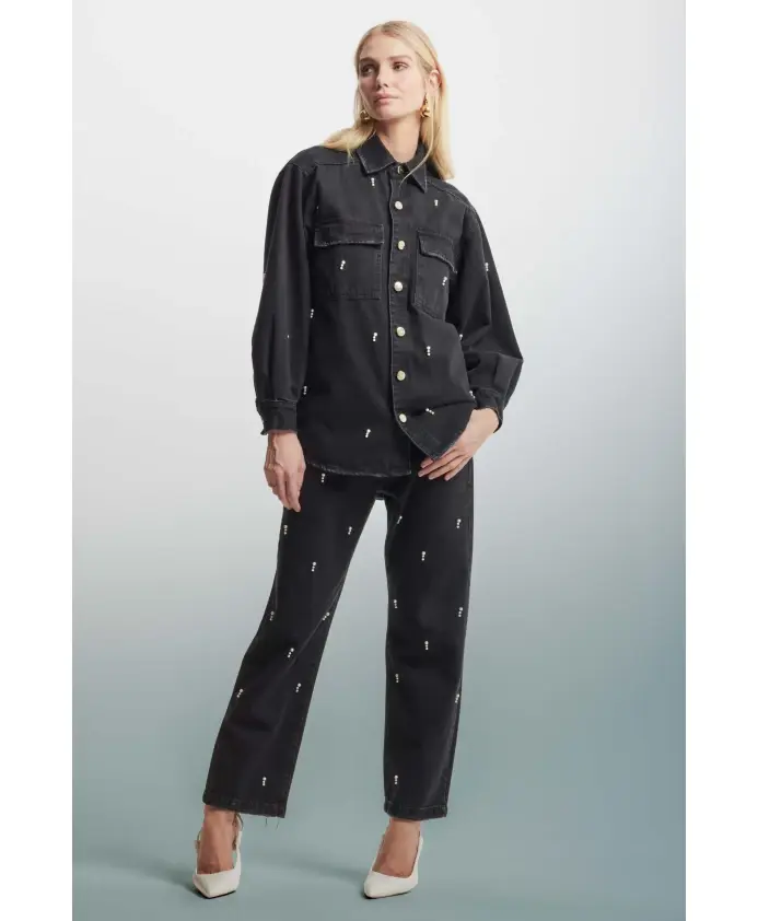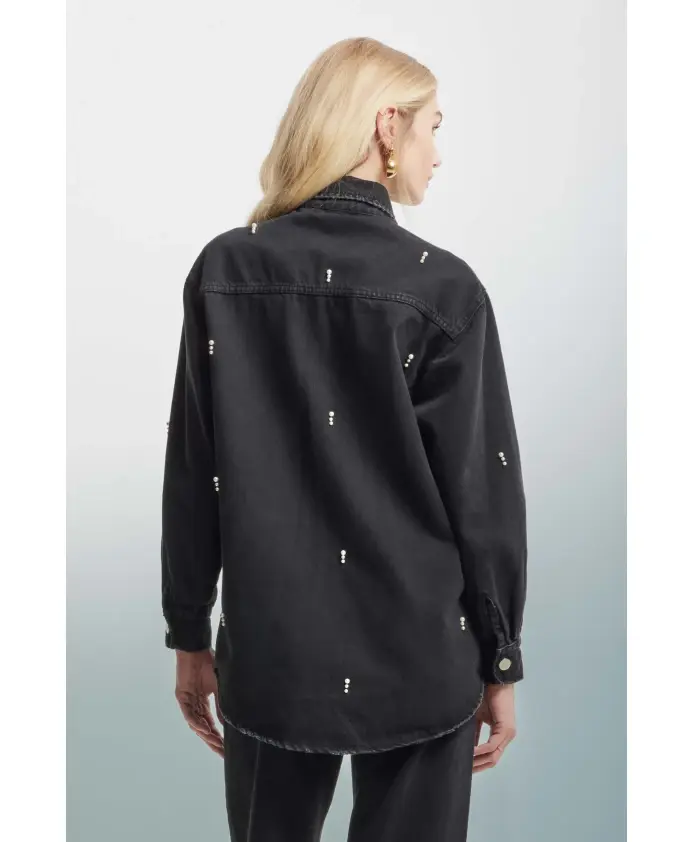 Рубашка из вискозного денима с потертой отделкой, украшенная вышивкой, накладными карманами и застегивающаяся на блестящие металлические пуговицы.