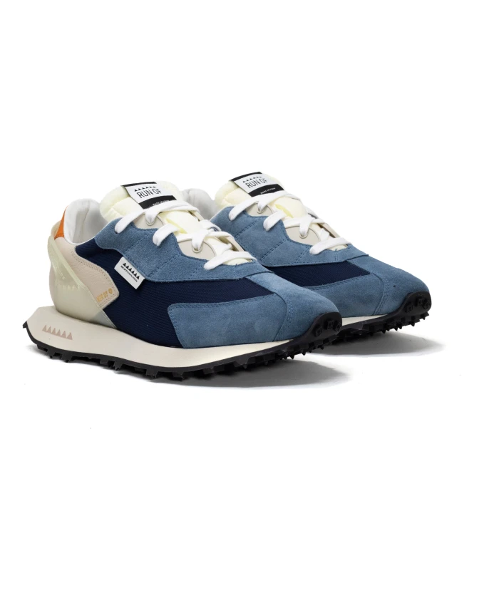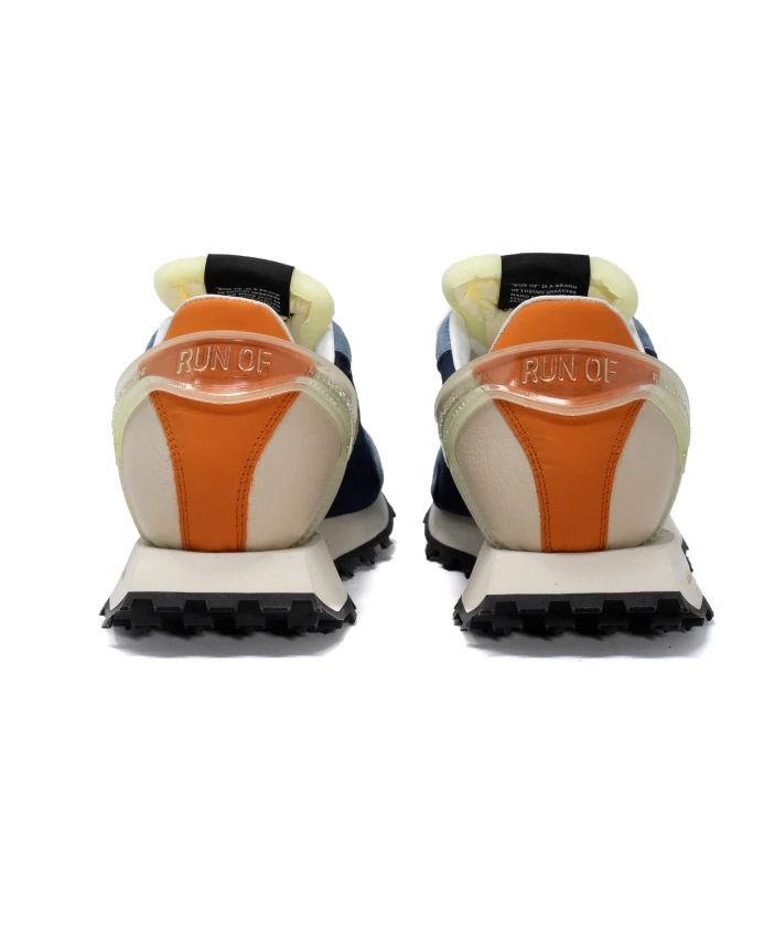 Кроссовки СИНЕГО цвета из спилка, МОРСКОЙ синтетической ткани и ОРАНЖЕВОГО задника. Резиновая подошва белого/черного цвета. Хлопковые шнурки. Сделано в Италии. Информация о размерах: рекомендуется на один размер больше.