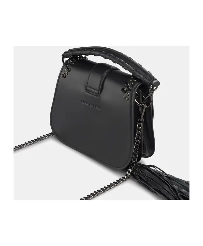 Сумка через плечо в формате квадратной сумки, украшенная стразами, заклепками из стразов и свисающей бахромой. Ремешок на руку и длинная металлическая цепочка с функцией плечевого ремня. Изготовлен из кожи с текстильной подкладкой. Магнитная застежка с декоративной пряжкой. Деталь кисточка с бахромой внизу.