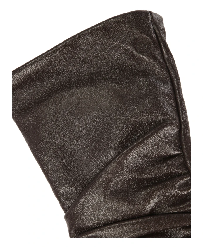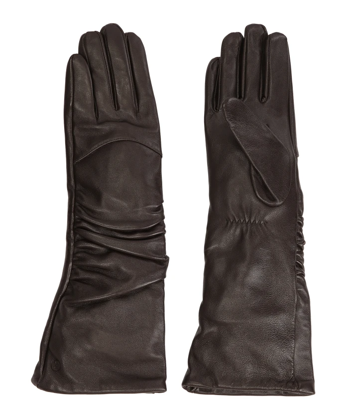 Элегантные длинные женские перчатки темно-коричневого цвета, изготовленные из высококачественной лицевой кожи, выделяются среди других благодаря своему уникальному дизайну. Обращает на себя внимание декоративная складка в верхней части перчаток, которая создает неповторимый визуальный эффект. Перчатки не только элегантны, но и обеспечивают максимальный комфорт и защиту от потери тепла. Уникальная длина модели позволяет практично сочетать ее с пальто с необычной длиной рукава. Концы указательного и большого пальцев адаптированы для сенсорных устройств.