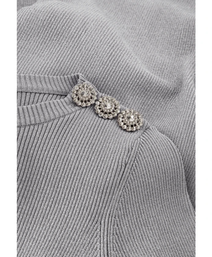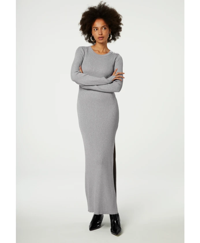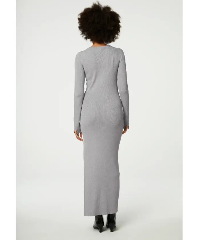 Серое женское платье-макси облегающего силуэта, с длинными рукавами и тремя серебряными пуговицами на левом плече. Это идеальное длинное платье из вискозы и нейлона станет незаменимым дополнением вашего гардероба.