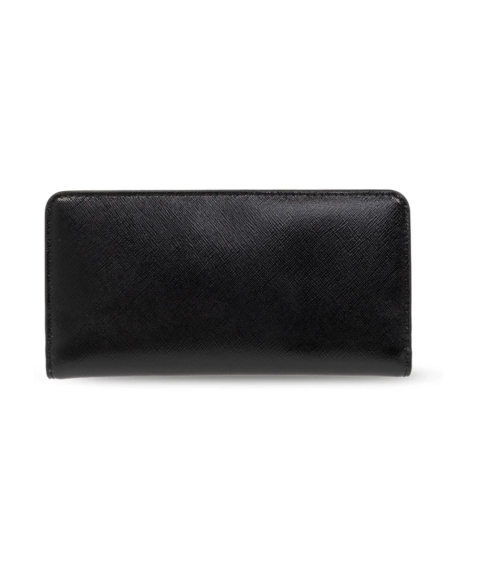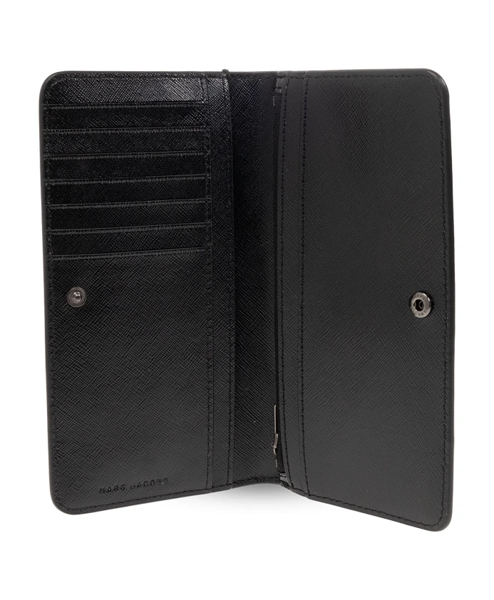 Черный кошелек от Marc Jacobs. Это изделие, выполненное из сафьяновой кожи, застегивается на кнопку и имеет прорезной карман для карточек и металлическую пластинку с логотипом спереди, а также карман для монет на молнии, три накладных кармана и семь отделений для карт внутри. Высота: 9 см Ширина: 18 см