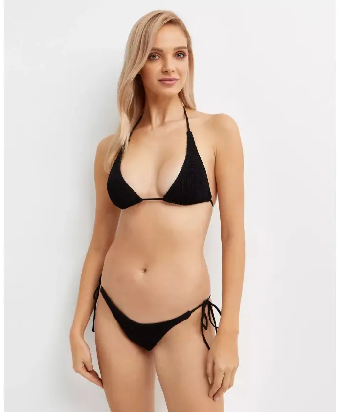 Лиф бикини Bond-Eye Luana классического черного цвета с треугольными чашками от Bond-Eye Australia. Регулируемые бретели можно носить на плече или на шее с помощью кружевных застежек. С видимой текстурой, из быстросохнущей ткани из переработанных материалов, подходит женщинам с размером чашки AD.