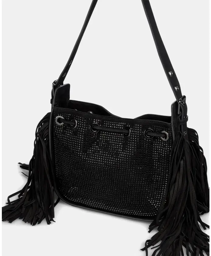 Сумка через плечо со стразами и бахромой по бокам. Широкая ручка и регулируемая застежка. Изготовлен из кожи с текстильной подкладкой.