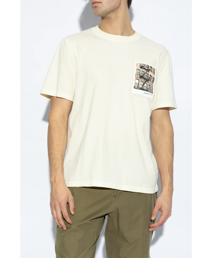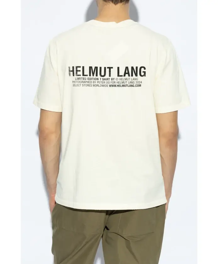 Эксклюзивная футболка HELMUT LANG воплощает минималистскую элегантность с художественным оттенком. Изготовленная из высококачественного хлопка, она имеет кремовый, нежный оттенок, излучающий изысканность. Классический крой с короткими рукавами и круглым вырезом обеспечивает комфорт и универсальность. Уникальные графические детали придают футболке особый характер. На груди принт с фотографией здания и пожарной лестницы, сопровождаемый подписью, добавляющей художественной глубины. Сзади есть большой