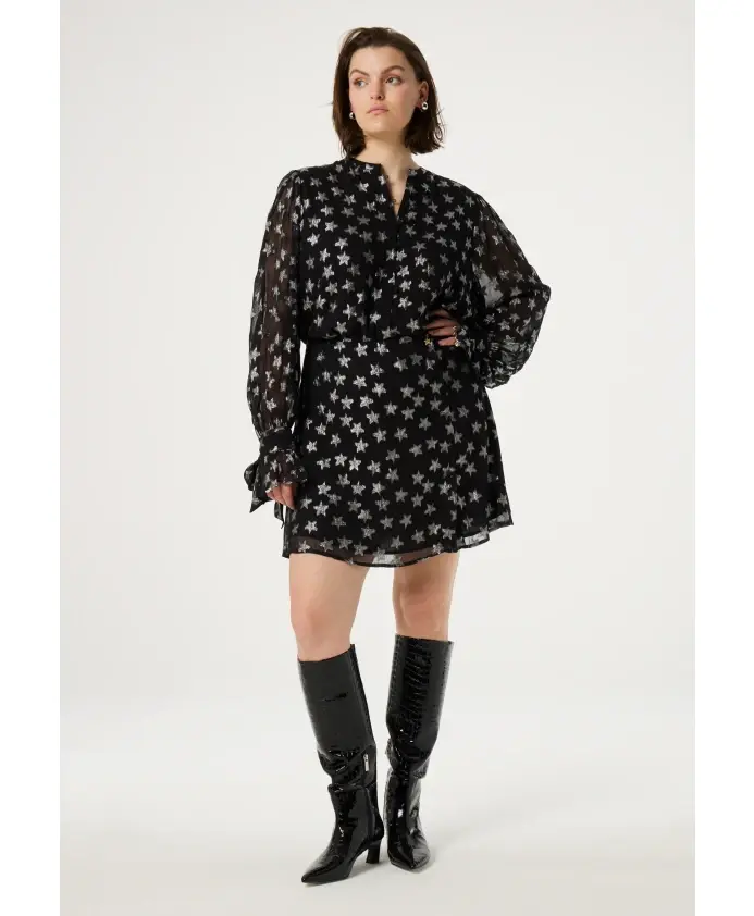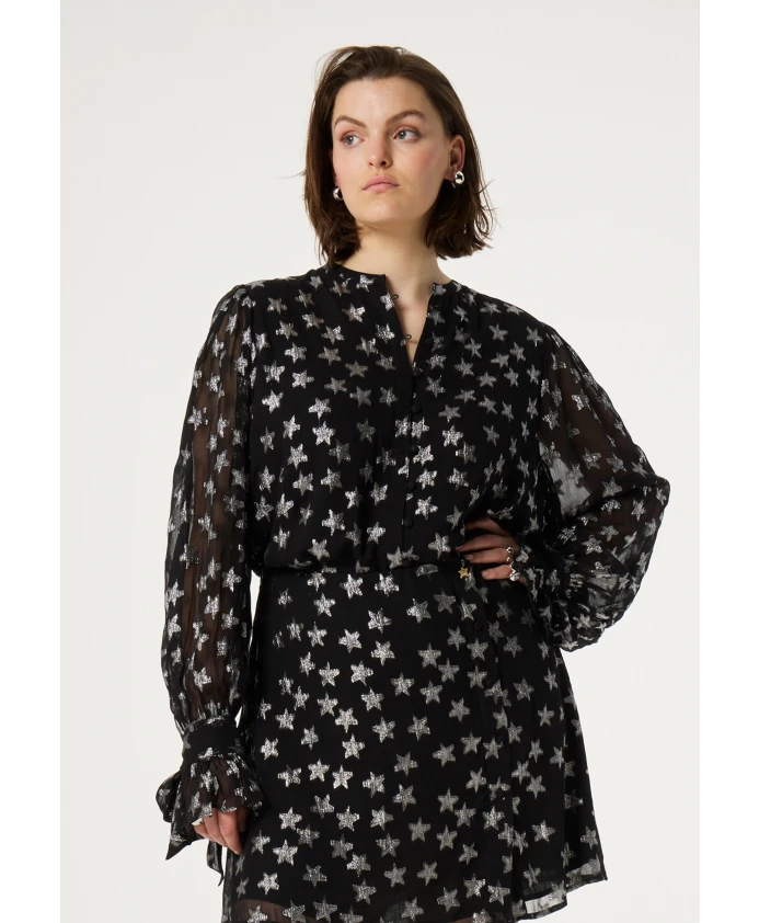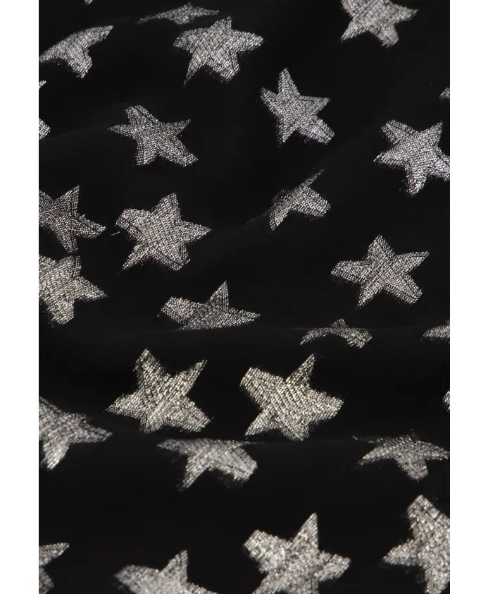 Черная женская блузка с обтянутыми тканью пуговицами, длинными рукавами и принтом с серебряными звездами по всей поверхности. Это один из наших наиболее экологичных стилей, изготовленный из вискозы. Сочетайте его с нашей подходящей фиолетовой юбкой, чтобы создать идеальный вечерний образ.