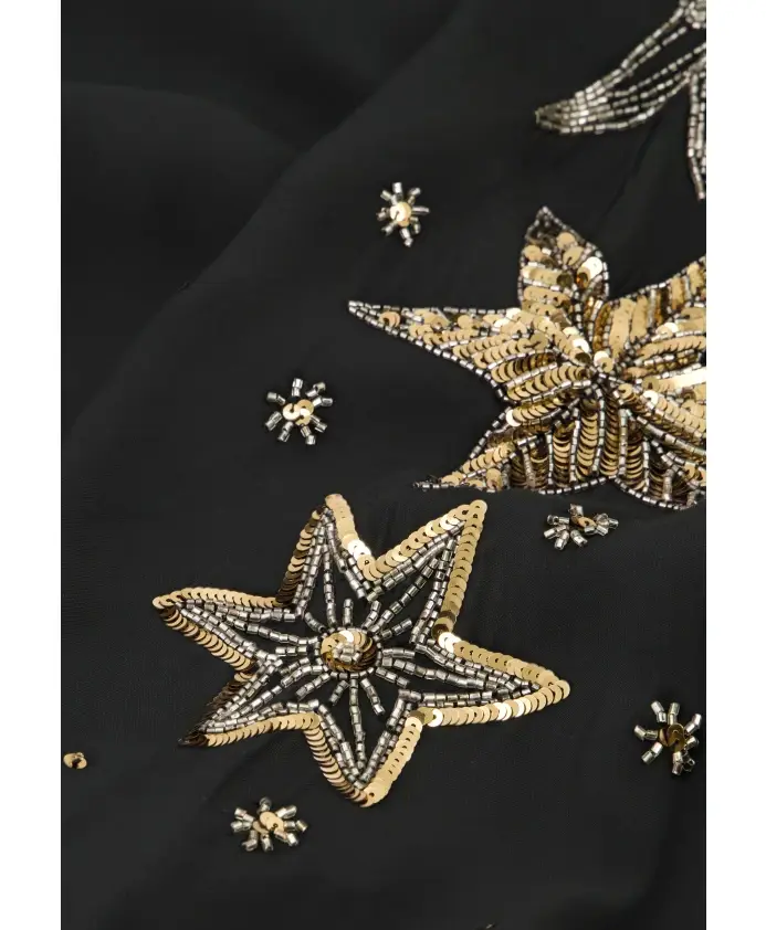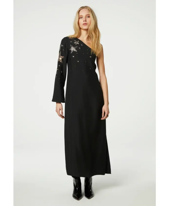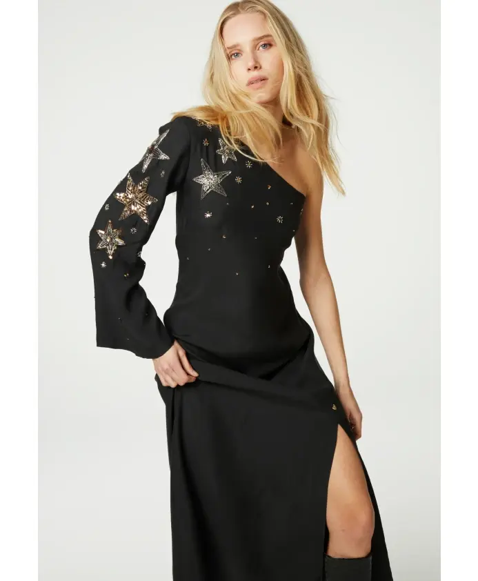 Это черное женское платье с дизайном на одно плечо имеет длину миди, длинные рукава и вышивку в виде звезд, которая придает дизайну особую деталь. Изготовленный из вискозы, это один из наших наиболее экологичных стилей. Это платье станет отличным украшением вашего вечернего наряда.