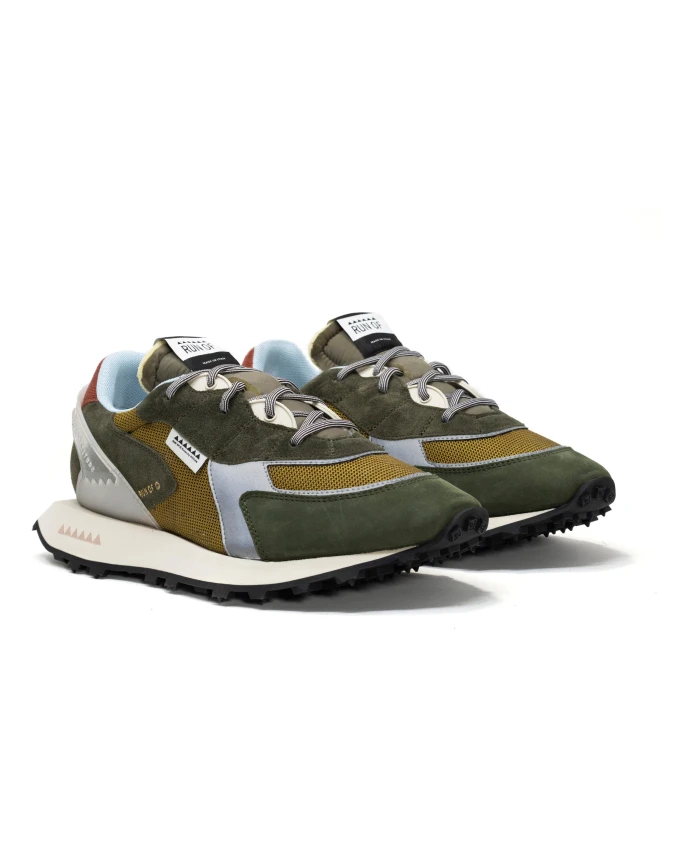 Кроссовки темно-зеленого цвета из спилка с текстилем в золотом и красном пятке, резиновая подошва белого/черного цвета. Сделано в Италии. Информация о размерах - рекомендуется на размер больше.