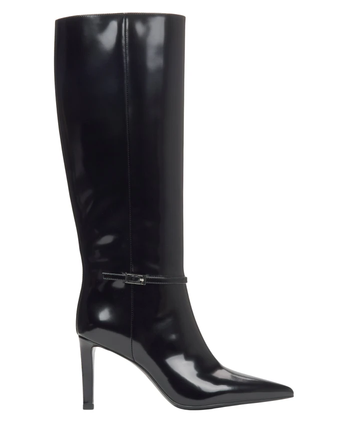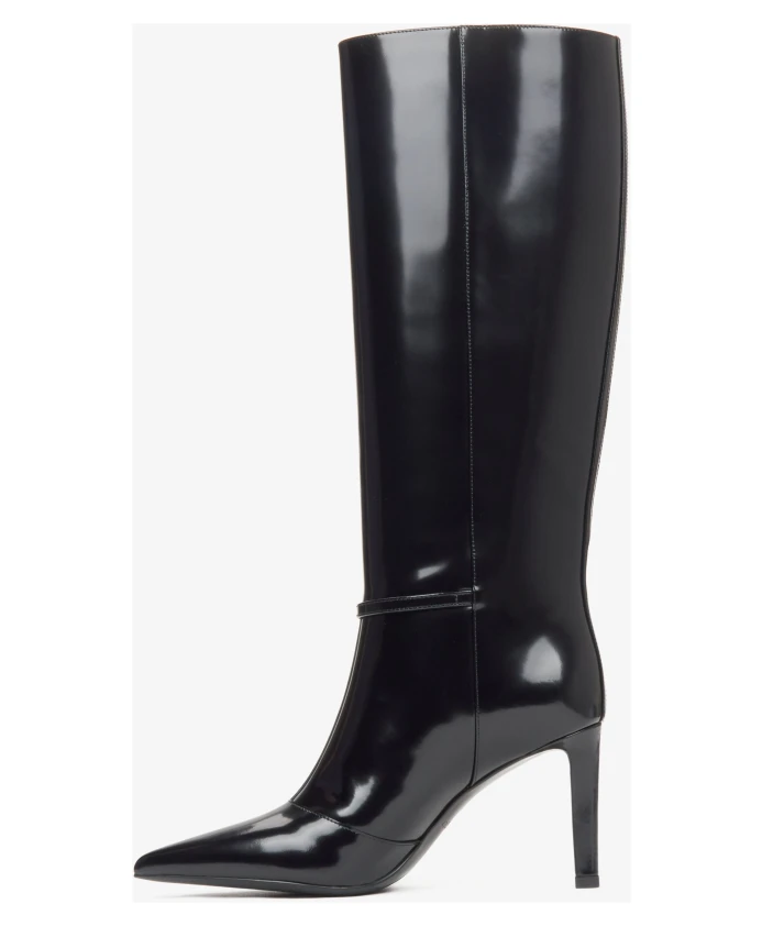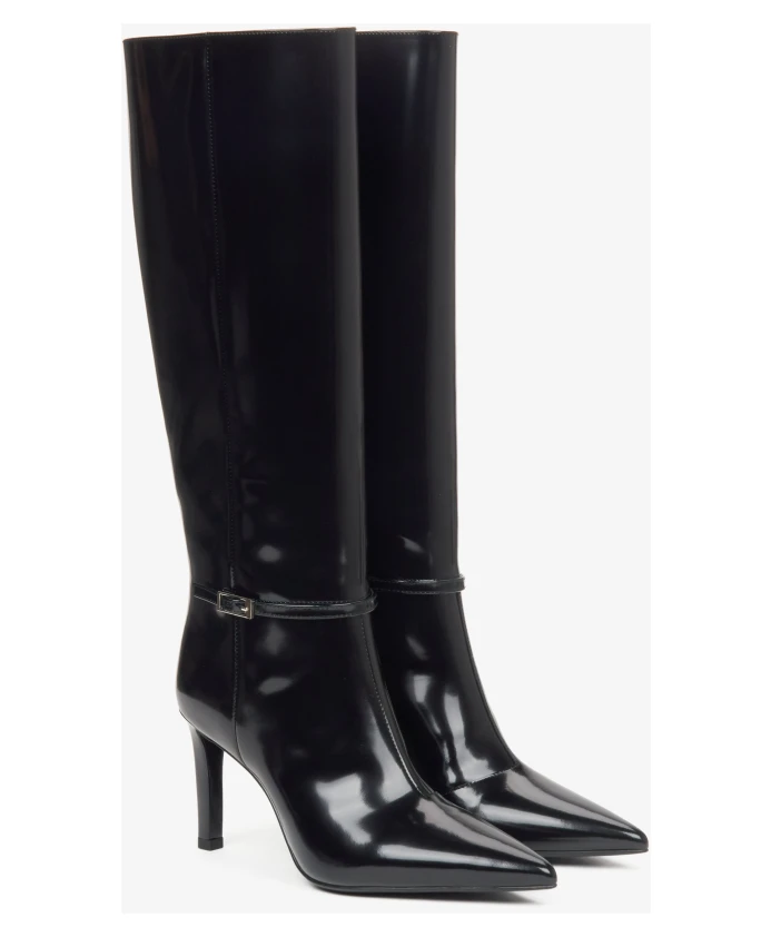 Черные сапоги до колена Estro из коллекции Осень 2024 выполнены из лакированной кожи с подкладкой из натуральной кожи. Они имеют каблук-шпильку высотой 9 см и декоративную пряжку на щиколотке. Общая высота 38,5 см и ширина верха 36 см предназначены для людей с узкой стопой (ширина F). Для удобства ботинки можно надевать без шнуровки. Длина стельки: 35 – 22,5 см | 36–23 см | 37–23,5 см | 38–24,5 см | 39–25 см | 40–25,5 см | 41–26 см
