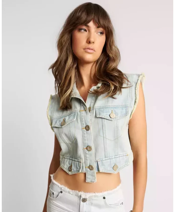 Оставайтесь стильными с этим голубым женским жилетом One Teaspoon. Укороченный крой, застежка на пуговицы с тисненым логотипом, классический воротник, задние карманы с клапаном, вышитый логотип, типичные для бренда декоративные потертости, все выполнено из 100% хлопка.