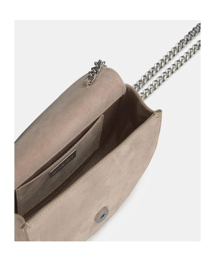 Сумка в форме полумесяца со змеиной головой из стразов. Металлический ремешок на руку в форме кольца и длинная металлическая цепочка с функцией плечевого ремня. Изготовлен из кожи с текстильной подкладкой. Магнитная застежка с драгоценными камнями на переднем клапане.