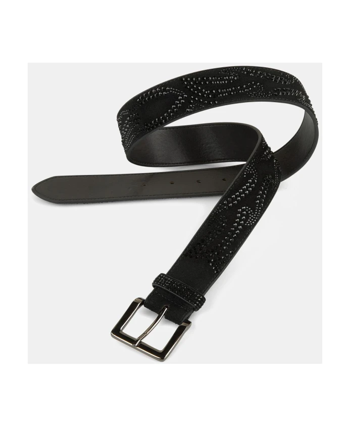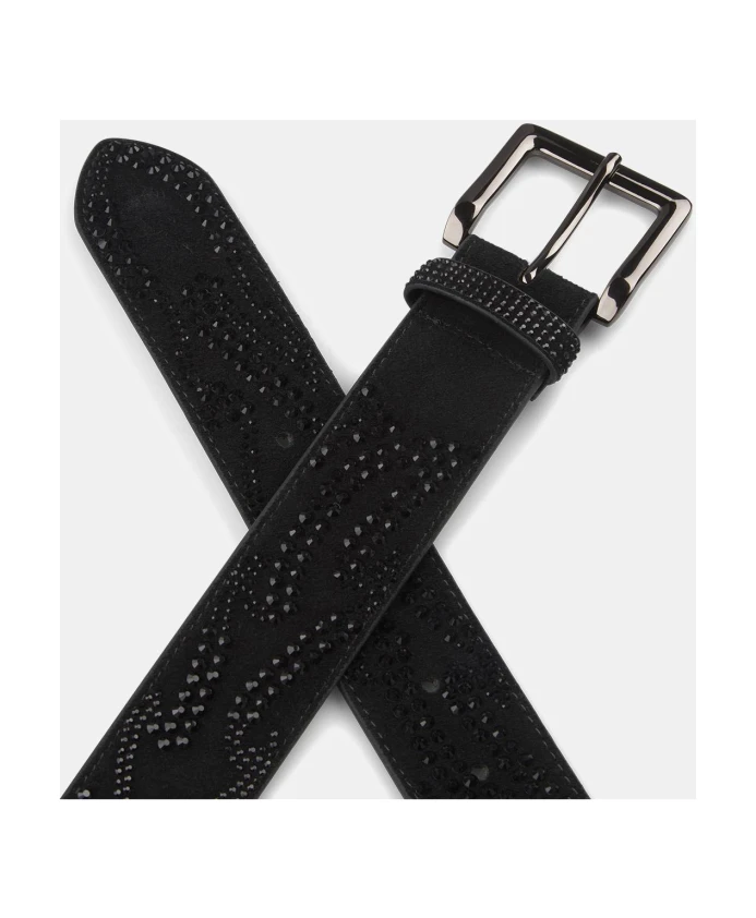Кожаный ремень шириной 4 см со стразами в форме пламени. Квадратная металлическая пряжка.