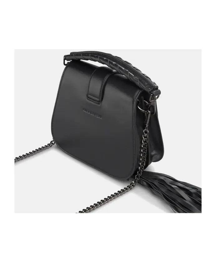 Размер сумки через плечо, пряжка со свисающей бахромой. Ремешок на руку и длинная металлическая цепочка с функцией плечевого ремня. Изготовлен из кожи с текстильной подкладкой. Магнитная застежка с драгоценной пряжкой. Деталь кисточка с бахромой внизу.