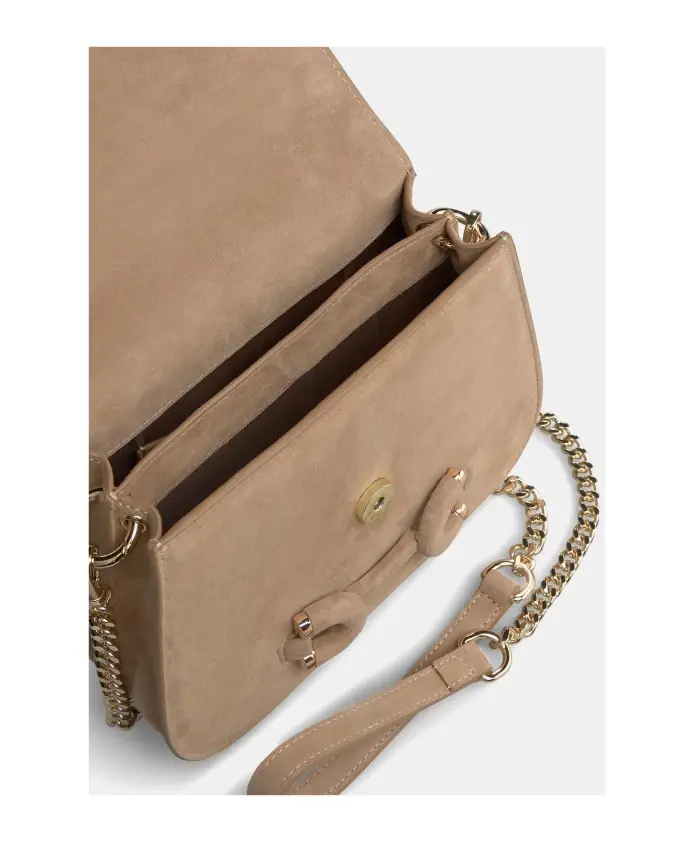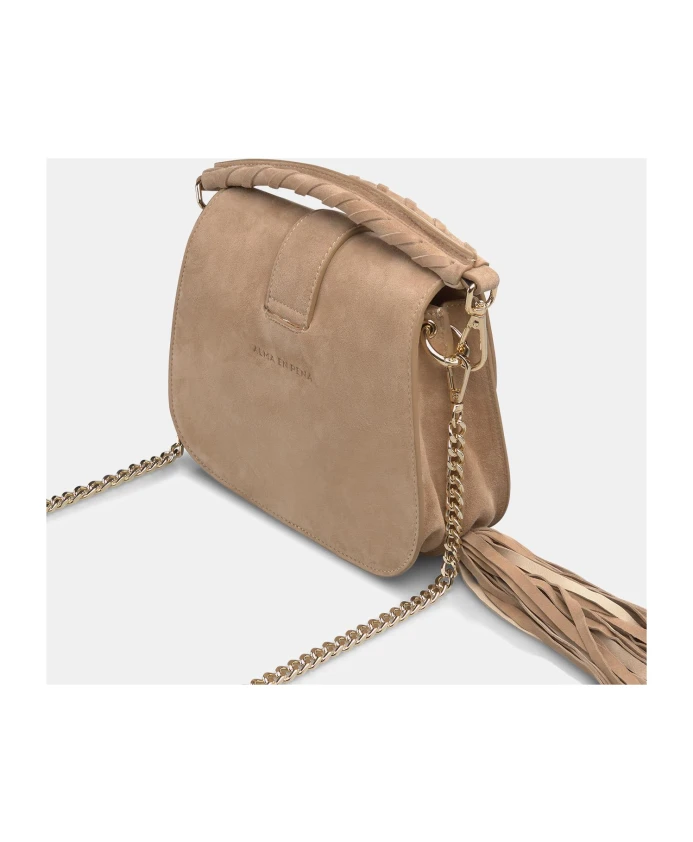 Размер сумки через плечо, пряжка со свисающей бахромой. Ремешок на руку и длинная металлическая цепочка с функцией плечевого ремня. Изготовлен из кожи с текстильной подкладкой. Магнитная застежка с драгоценной пряжкой. Деталь кисточка с бахромой внизу.