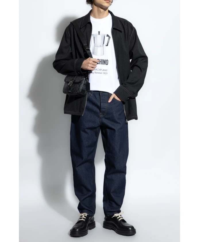 Презентация ФУТБОЛКИ С ПРИНТОМ от престижного бренда Moschino, шедевра, завораживающего своей оригинальностью и современным стилем. Изготовленная из высококачественного мягкого хлопка, она гарантирует не только комфорт, но и исключительную долговечность. На передней части футболки имеется крупный принт с изображением КОФЕМАШИНЫ В СТИЛЕ РЕТРО, который сочетается с