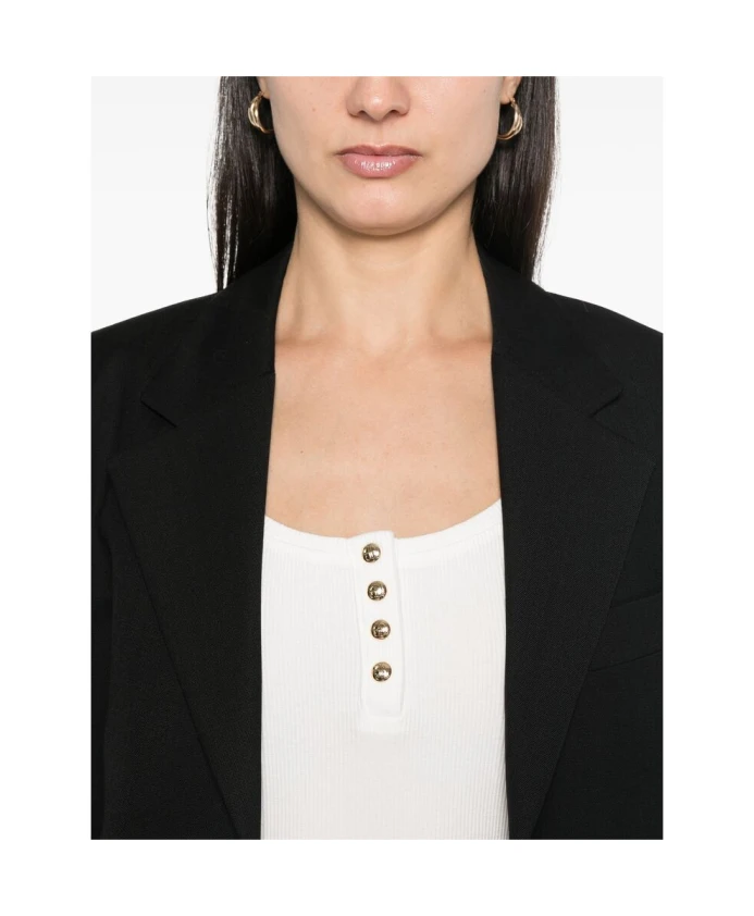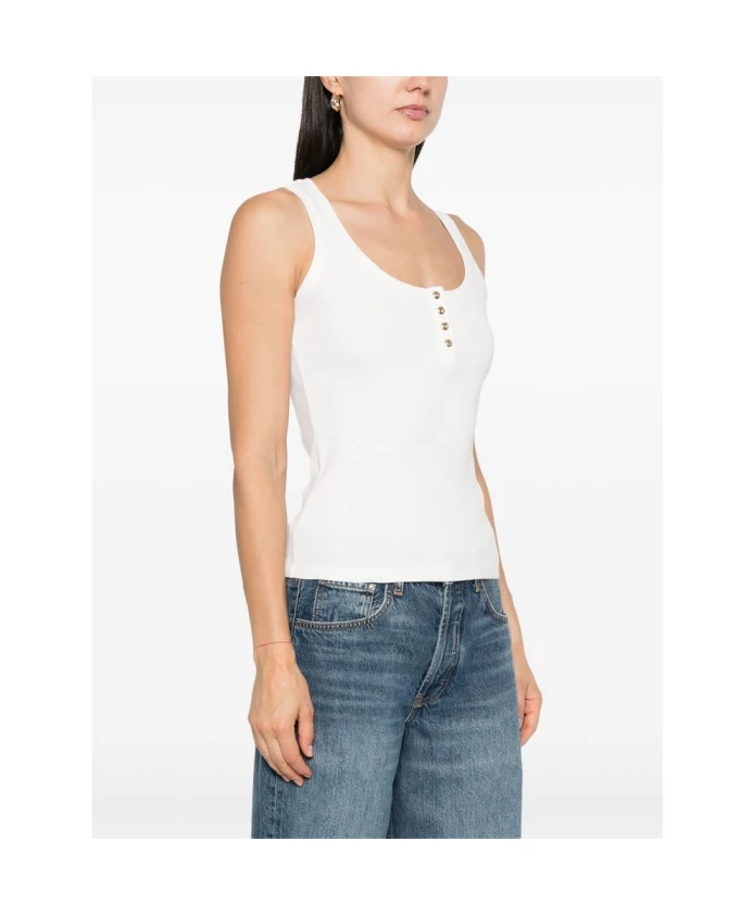 Обновите свой гардероб с помощью белого топа без рукавов Anine Bing. Модель изготовлена из эластичной смеси хлопка и имеет тонкую ребристую текстуру, короткую планку на кнопках спереди, овальный вырез, пуговицы с тиснением логотипа и прямой подол.